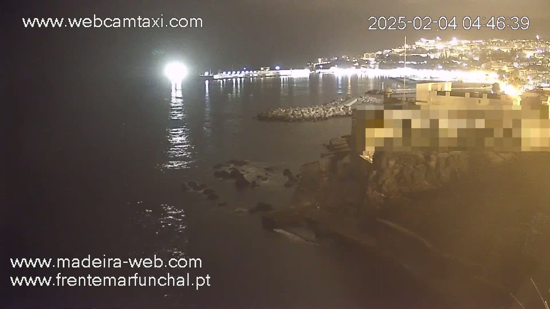 A nighttime, high-angle view shows waves crashing against a concrete seawall.