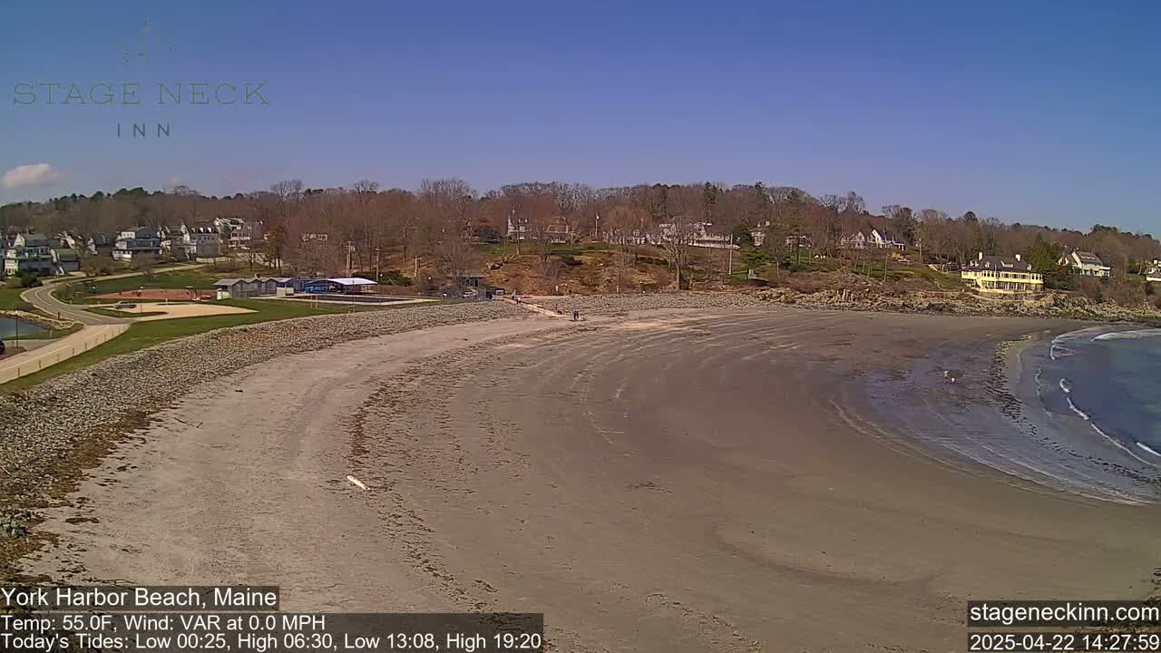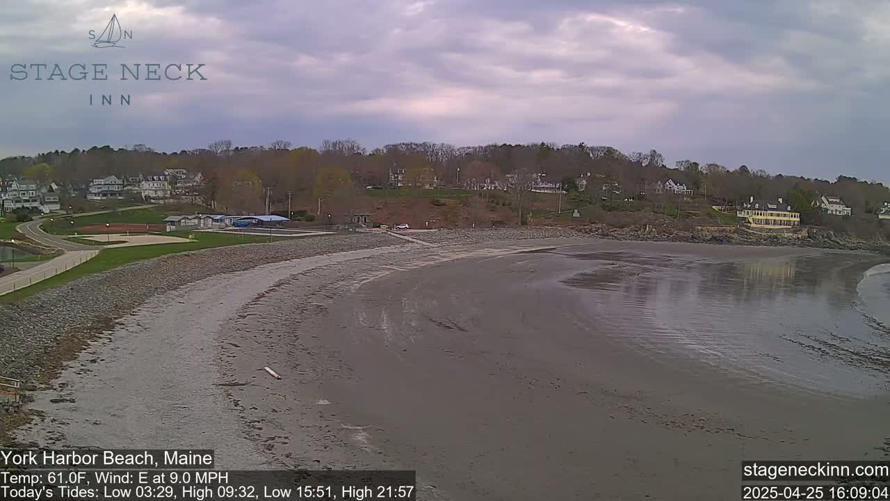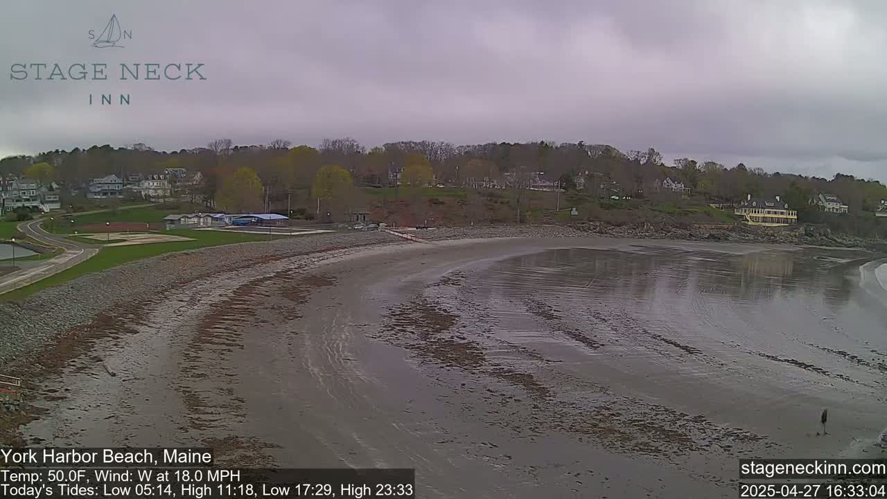 A snow-dusted beach curves along a wintry coastline dotted with houses and bare trees under a uniformly gray, overcast sky, with gentle waves lapping the shore.