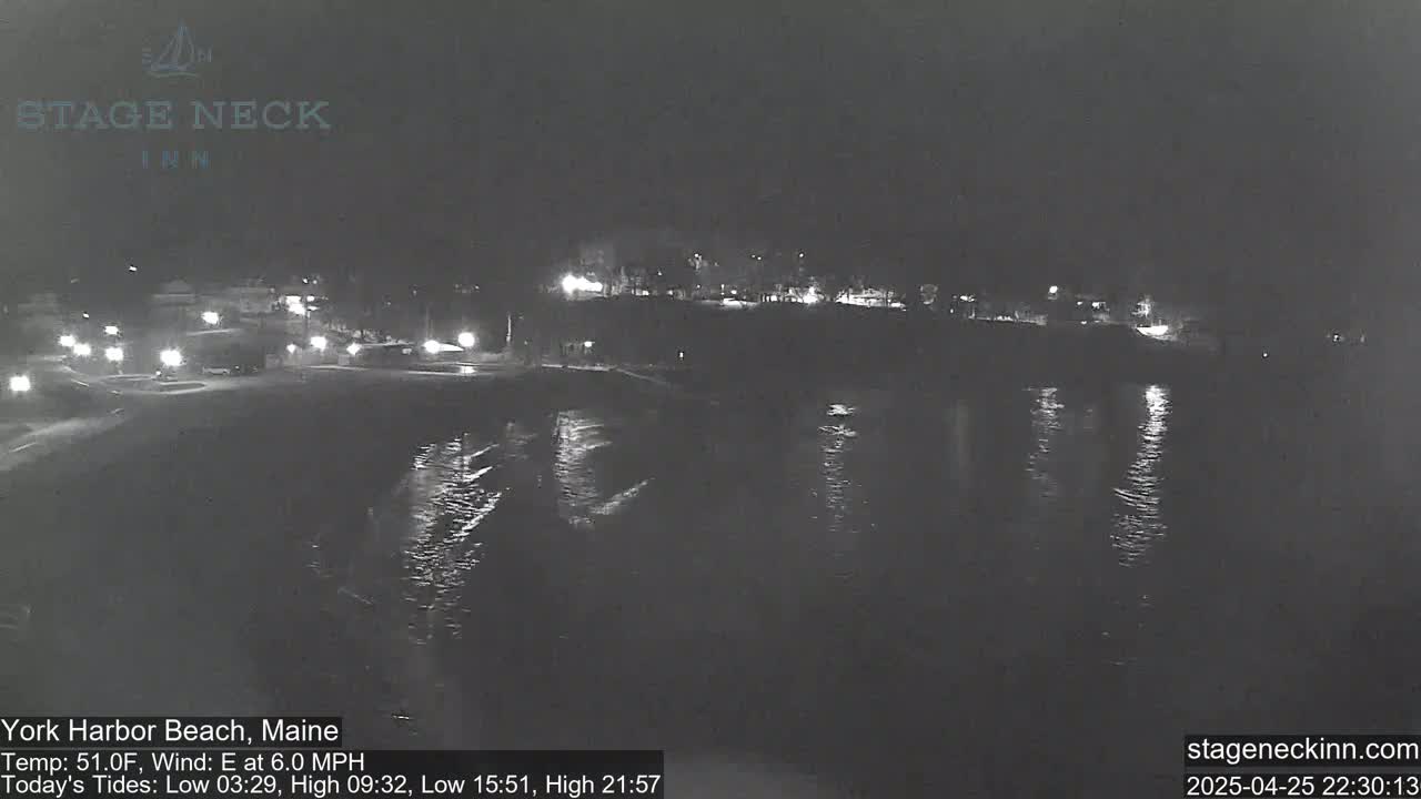 The image displays a dark, overcast night over a quiet coastal town, with streetlights and building lights illuminating snow-dusted ground and reflecting on the calm, dark water, indicating cold weather.