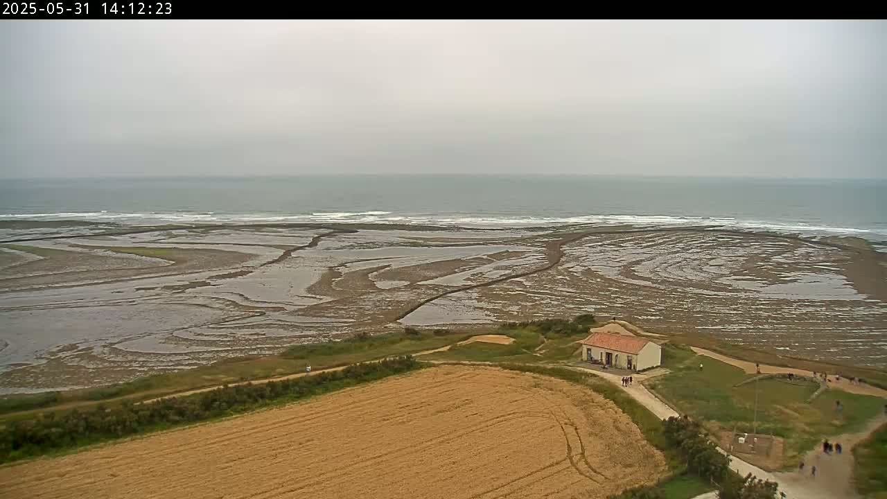 On an overcast day, a wide expanse of muddy tidal flats meets the sea with breaking waves, as seen from a green hillside where a small white house sits beside winding dirt paths.