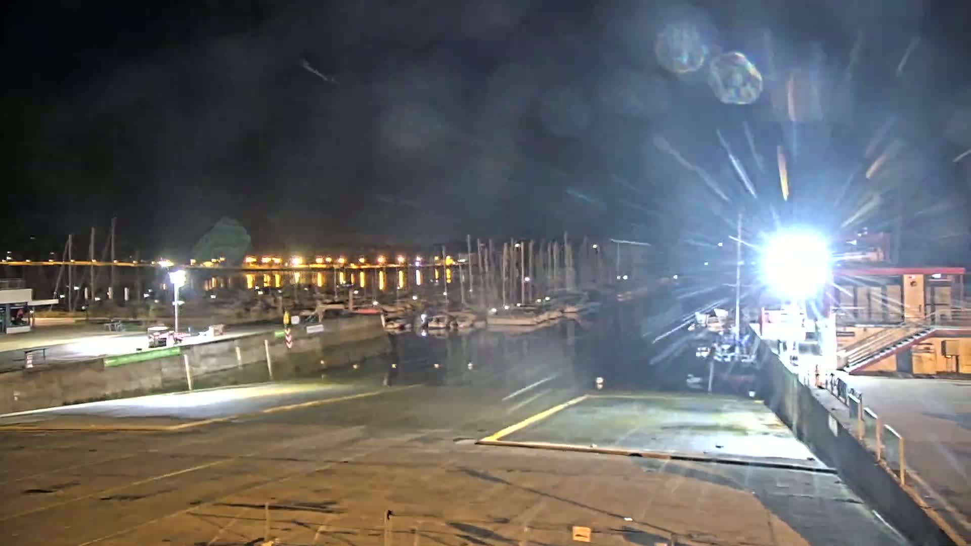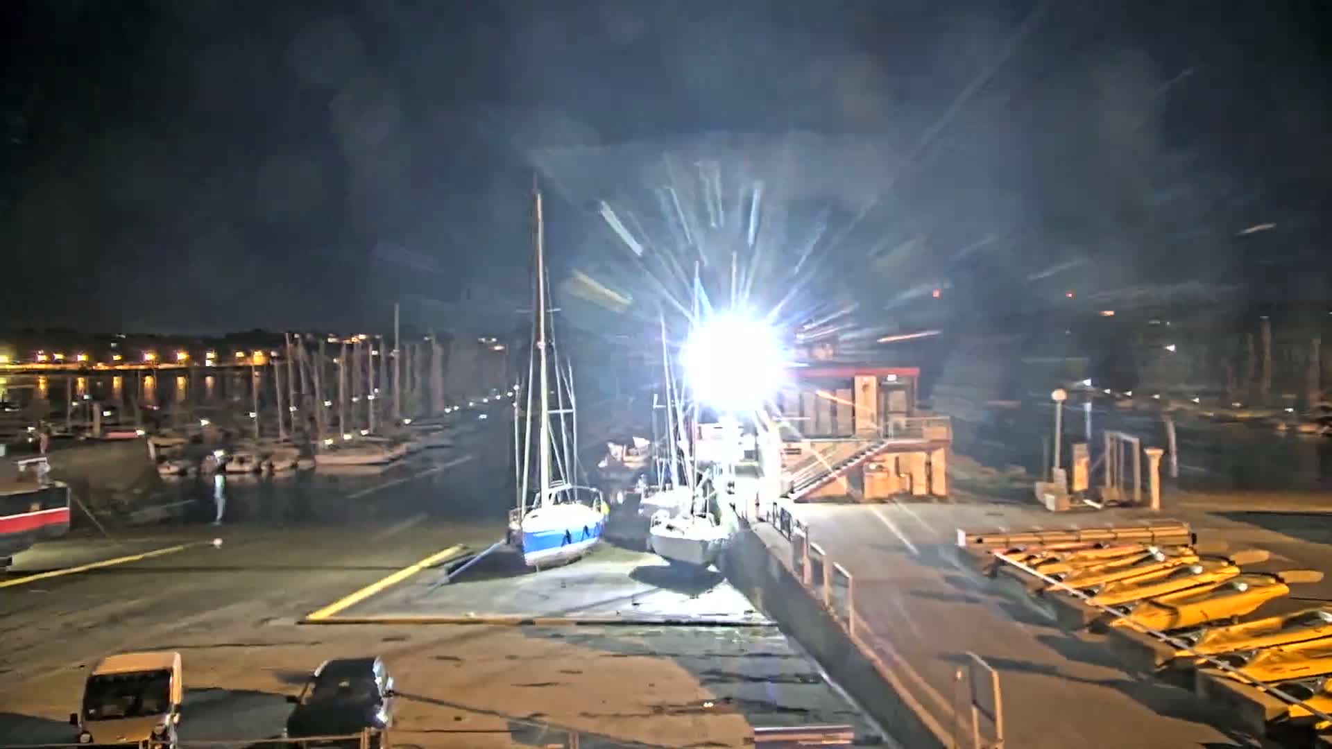 A powerful spotlight shines over a wet dock and marina filled with numerous boats under a dark, cloudy night sky.