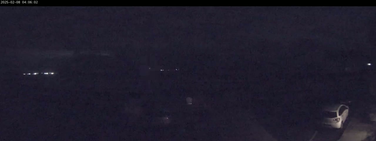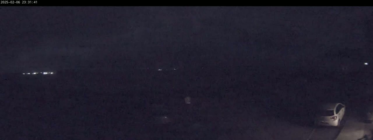 A dark, nighttime scene shows a few distant lights and a blurry object in the lower center.