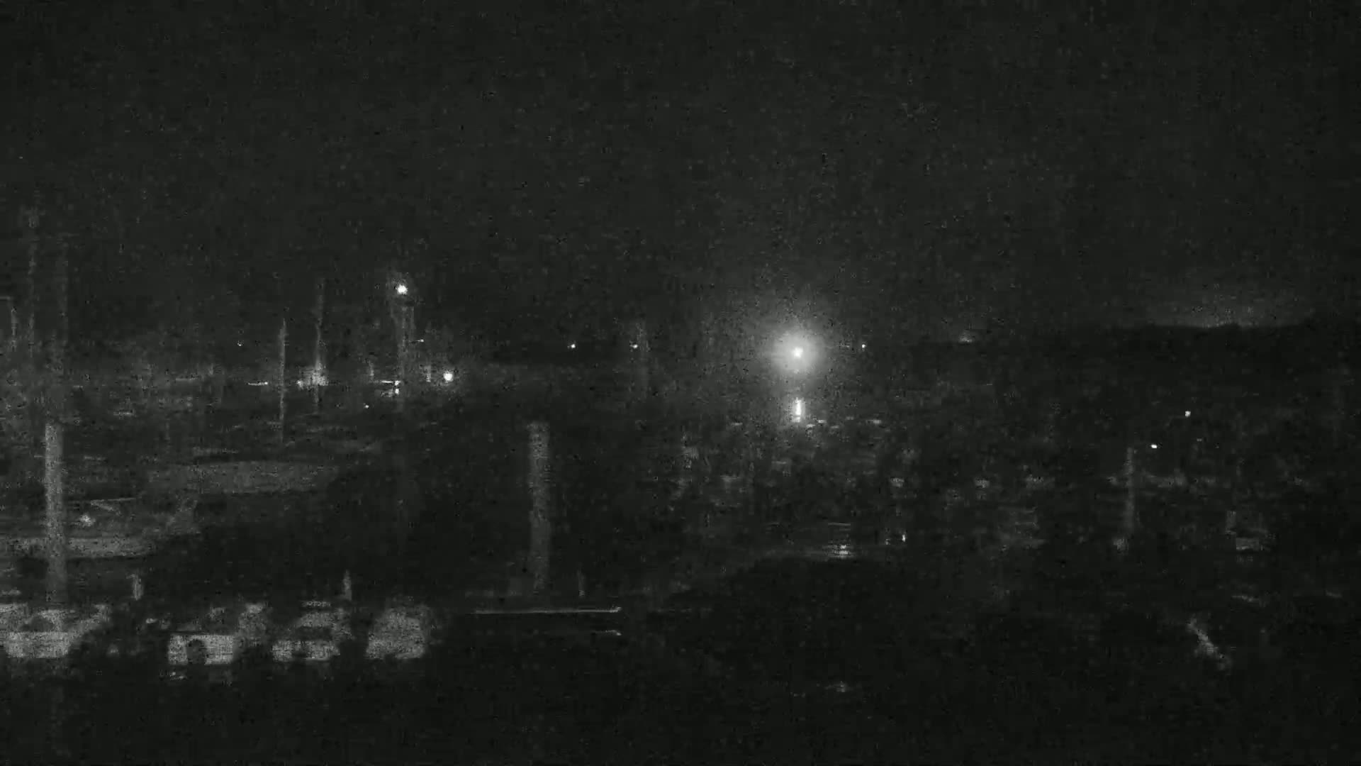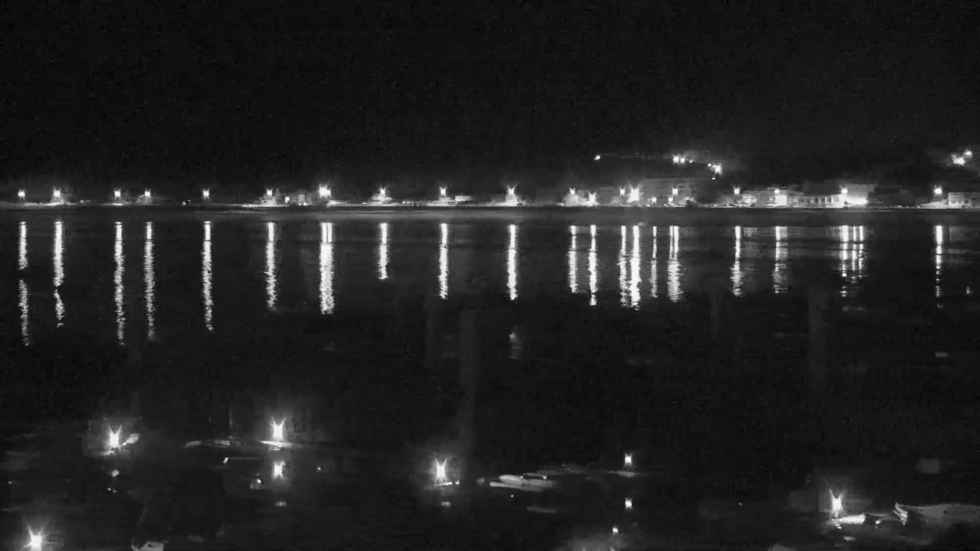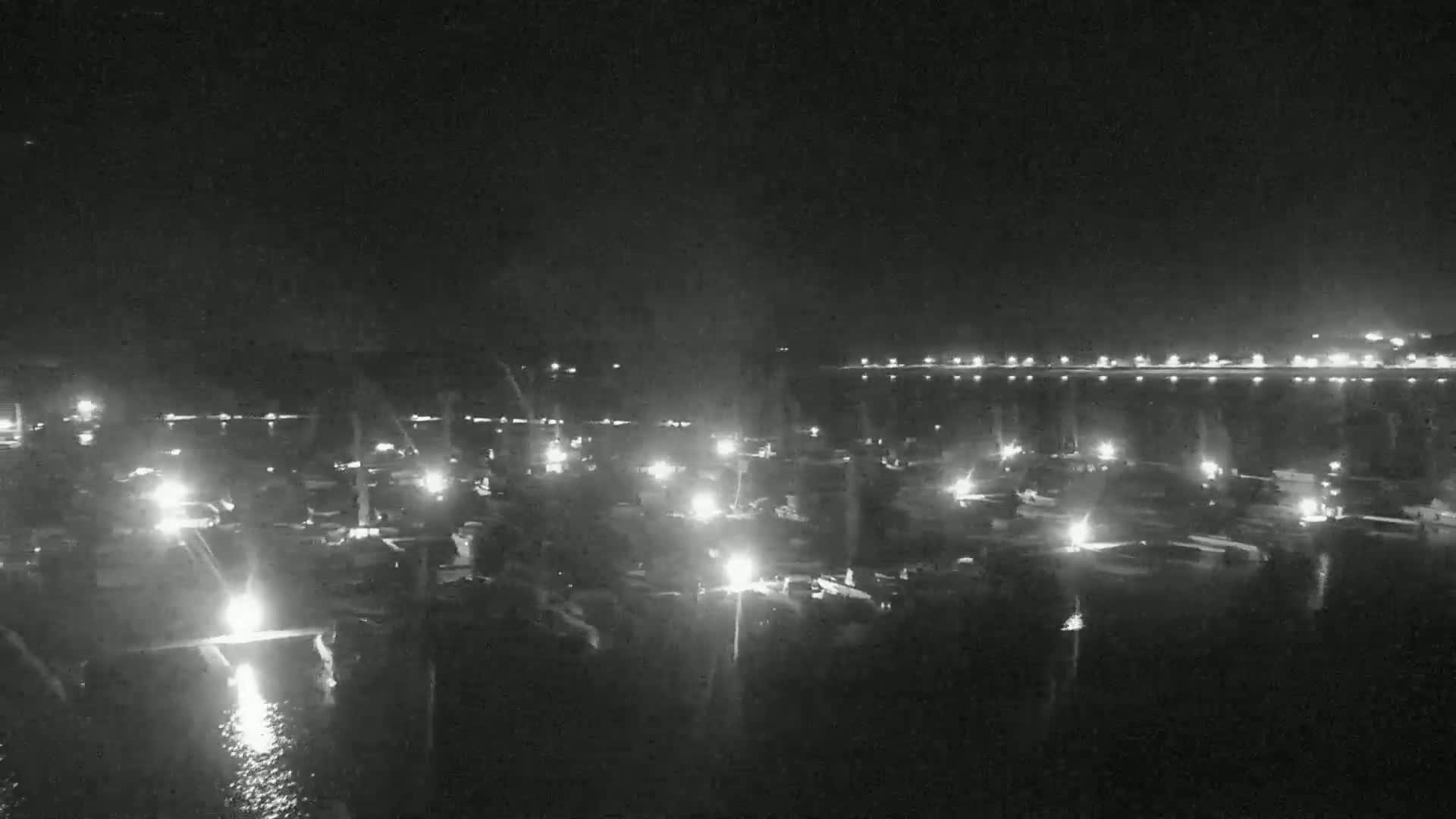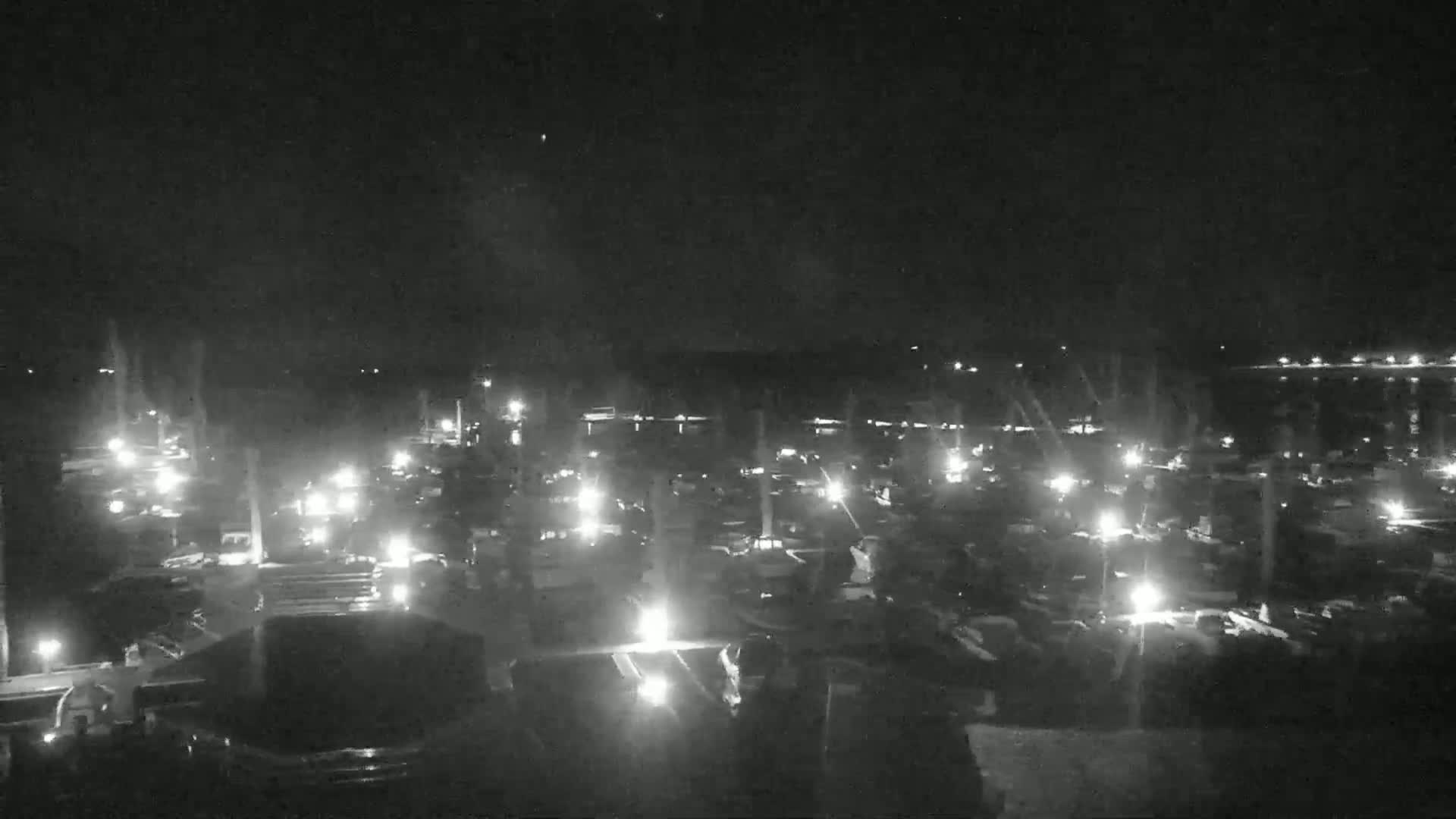 A nighttime, moonlit view of a marina filled with numerous boats, with a calm body of water and a distant shoreline visible under a partly cloudy sky.