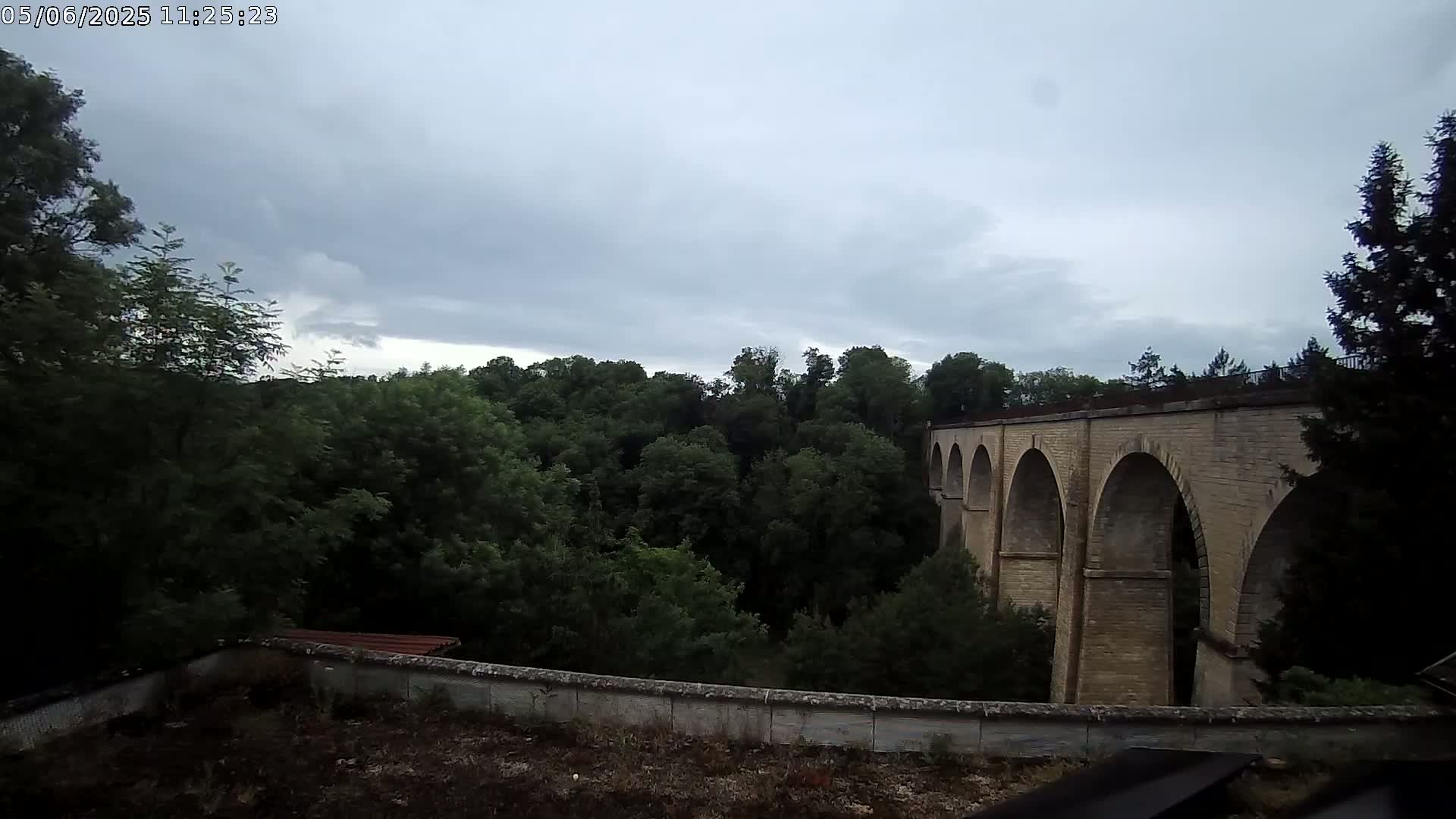 A long stone viaduct with multiple arches stretches across a densely forested valley filled with mostly bare trees, all under a heavily overcast and grey sky.