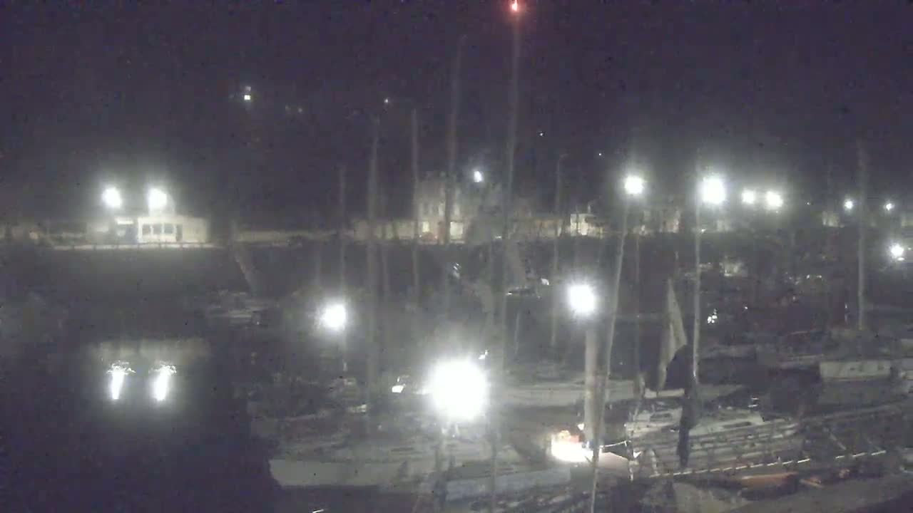 A nighttime, low-light view shows numerous boats docked at a marina with some lights visible on the water and nearby buildings.