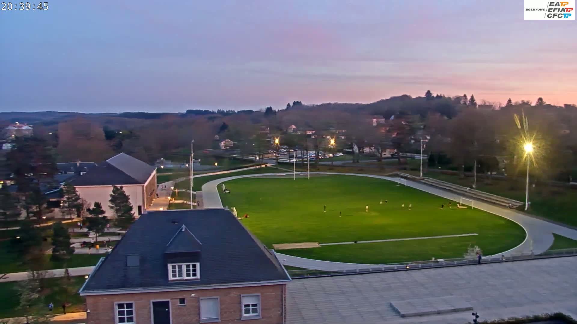 An aerial view shows a small, gabled building in a landscaped area with a running track and green fields, all under a clear, sunny sky.