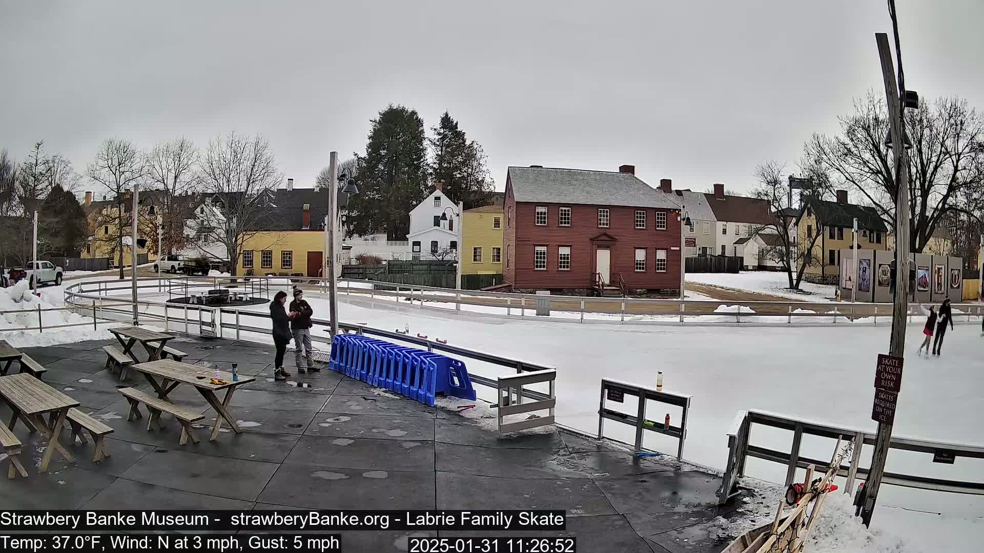 A patio with tables and umbrellas sits in front of a collection of historic-looking buildings on a sunny day with a southeast wind.