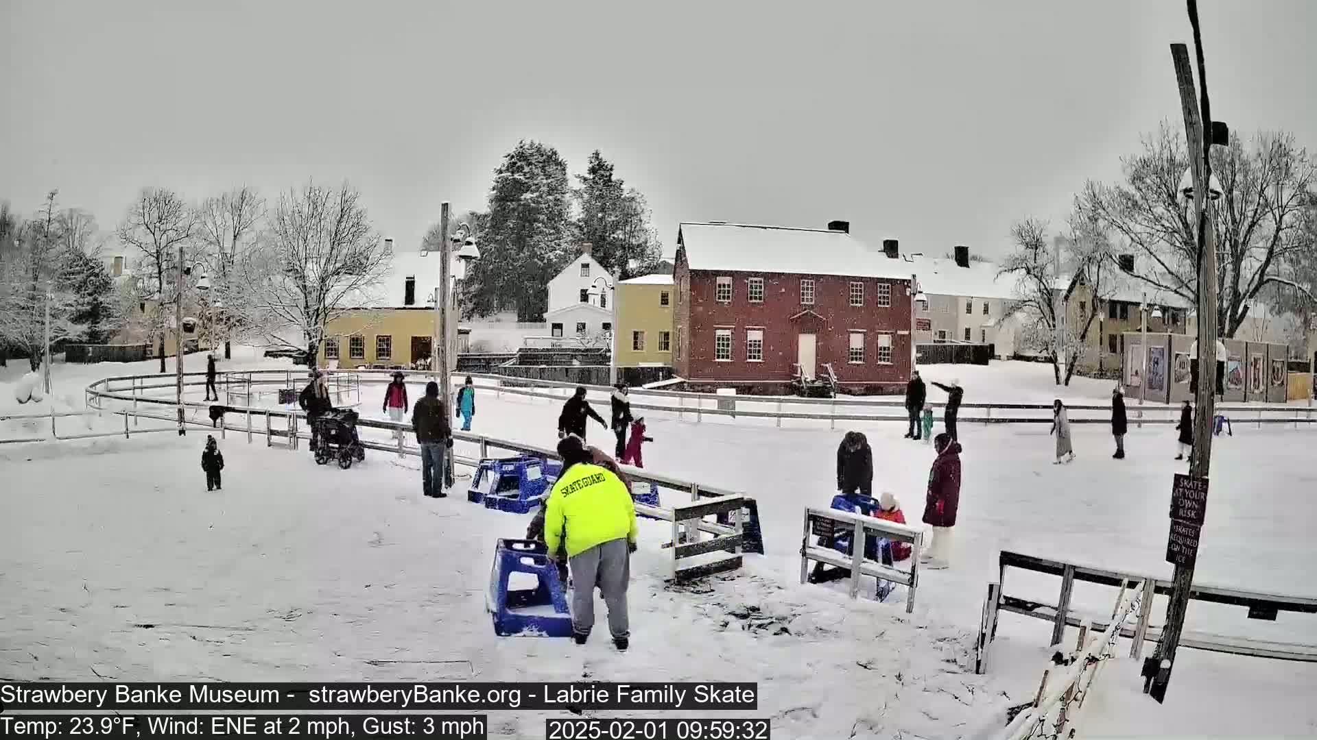 A nighttime view of a historical village with several colonial-style buildings illuminated under a dark, clear sky, with a southwest wind at 12 mph.