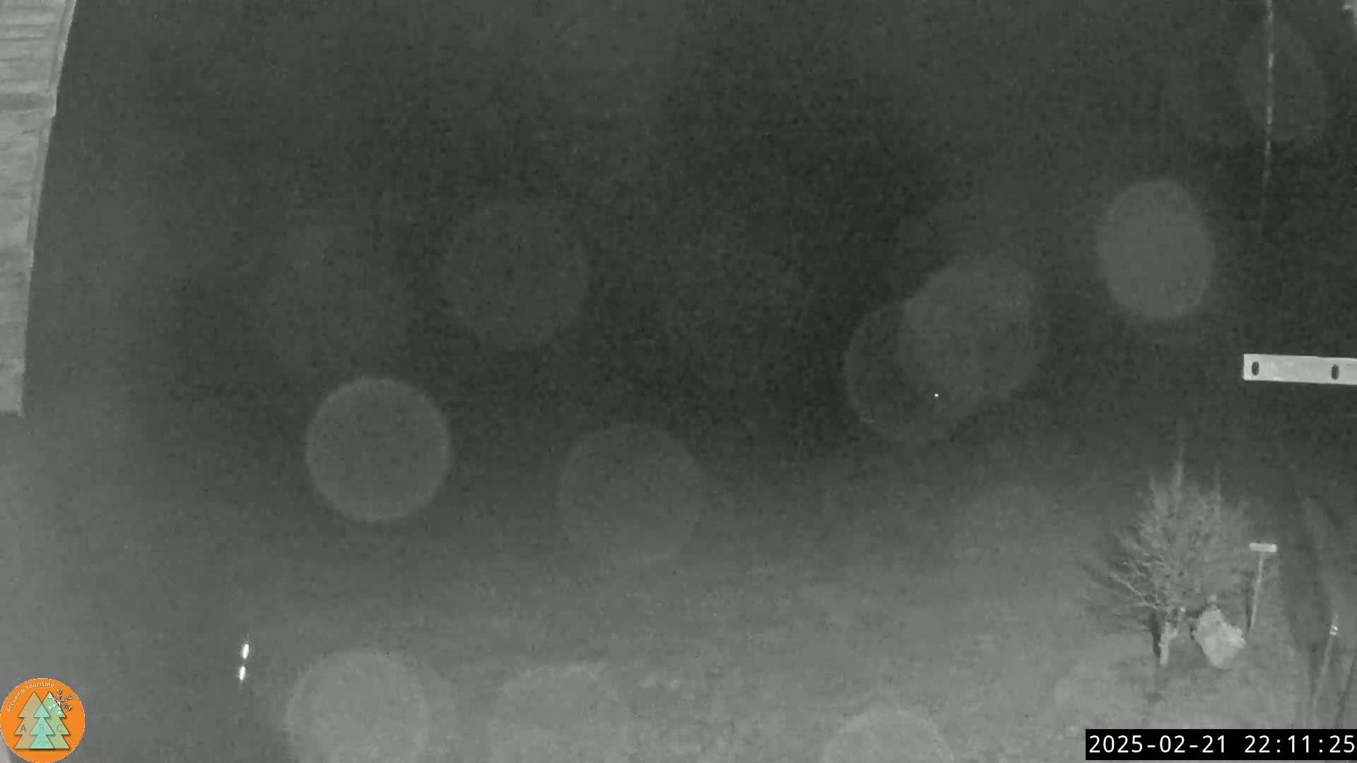 A blurry, nighttime grayscale image shows a dark yard with a small bush in the bottom right corner, speckled with out-of-focus bright spots.