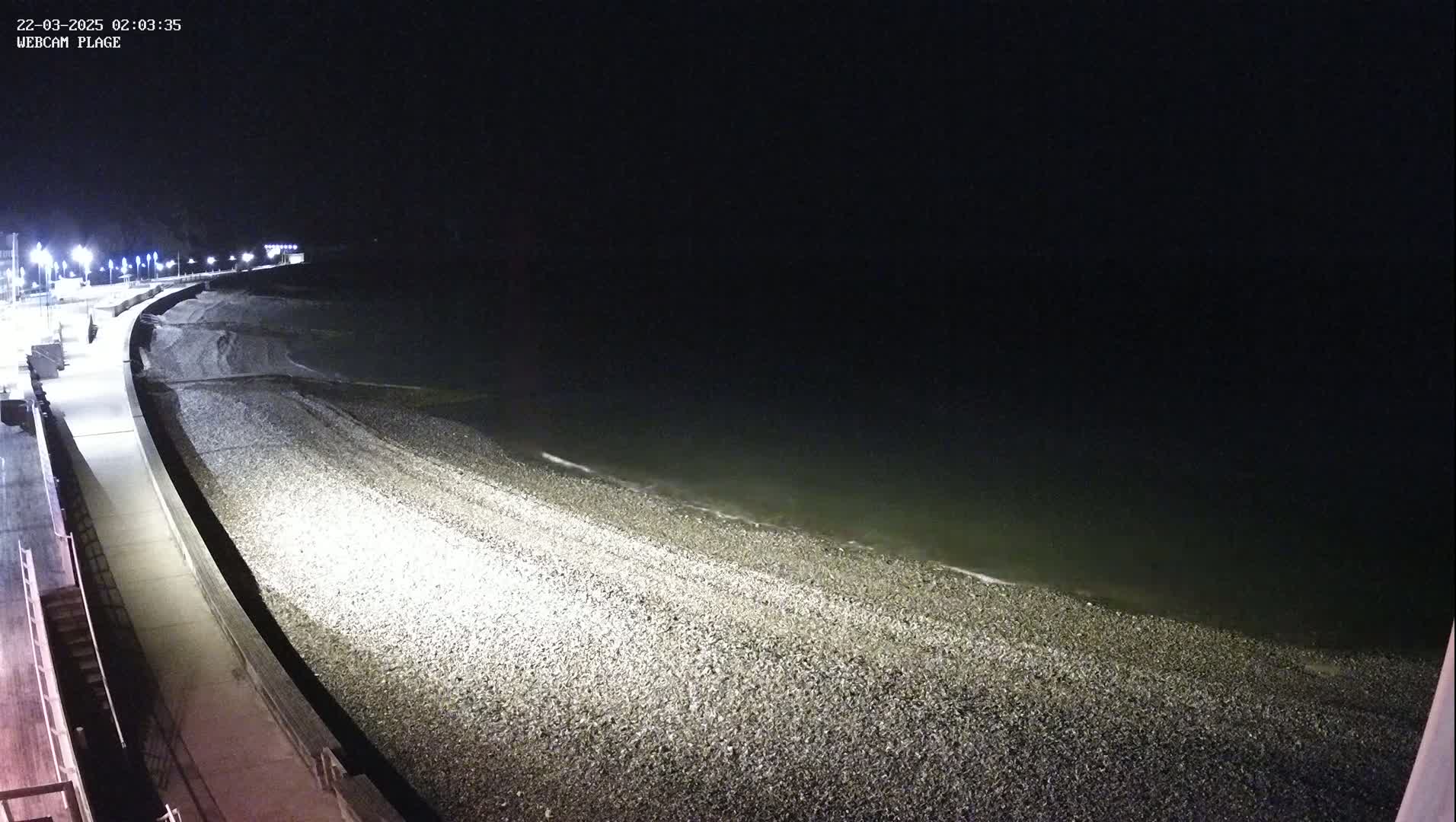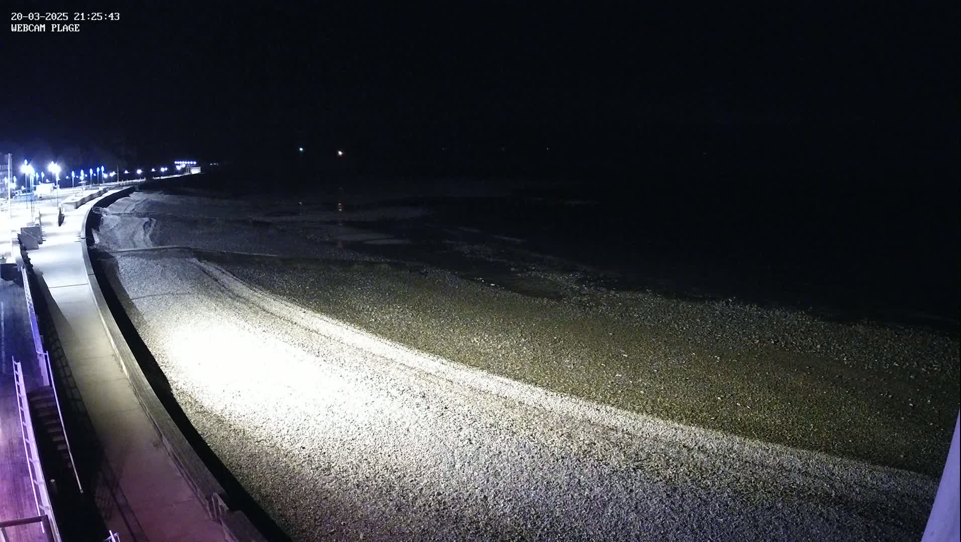 A pebble beach stretches alongside a paved walkway, leading to a calm sea under a mostly cloudy sky, with a distant lighthouse and cliff visible.
