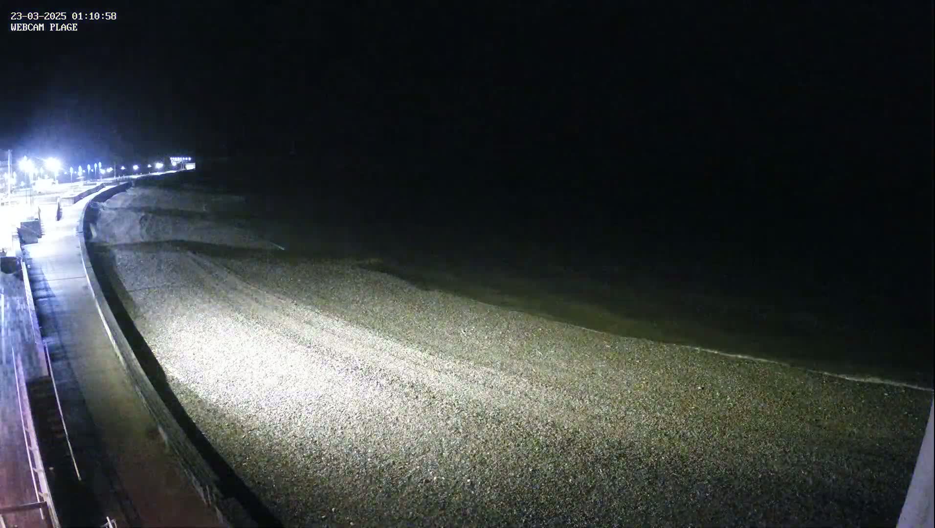 A pebble beach stretches along a gray, overcast sea, with a walkway and white buildings visible in the background.