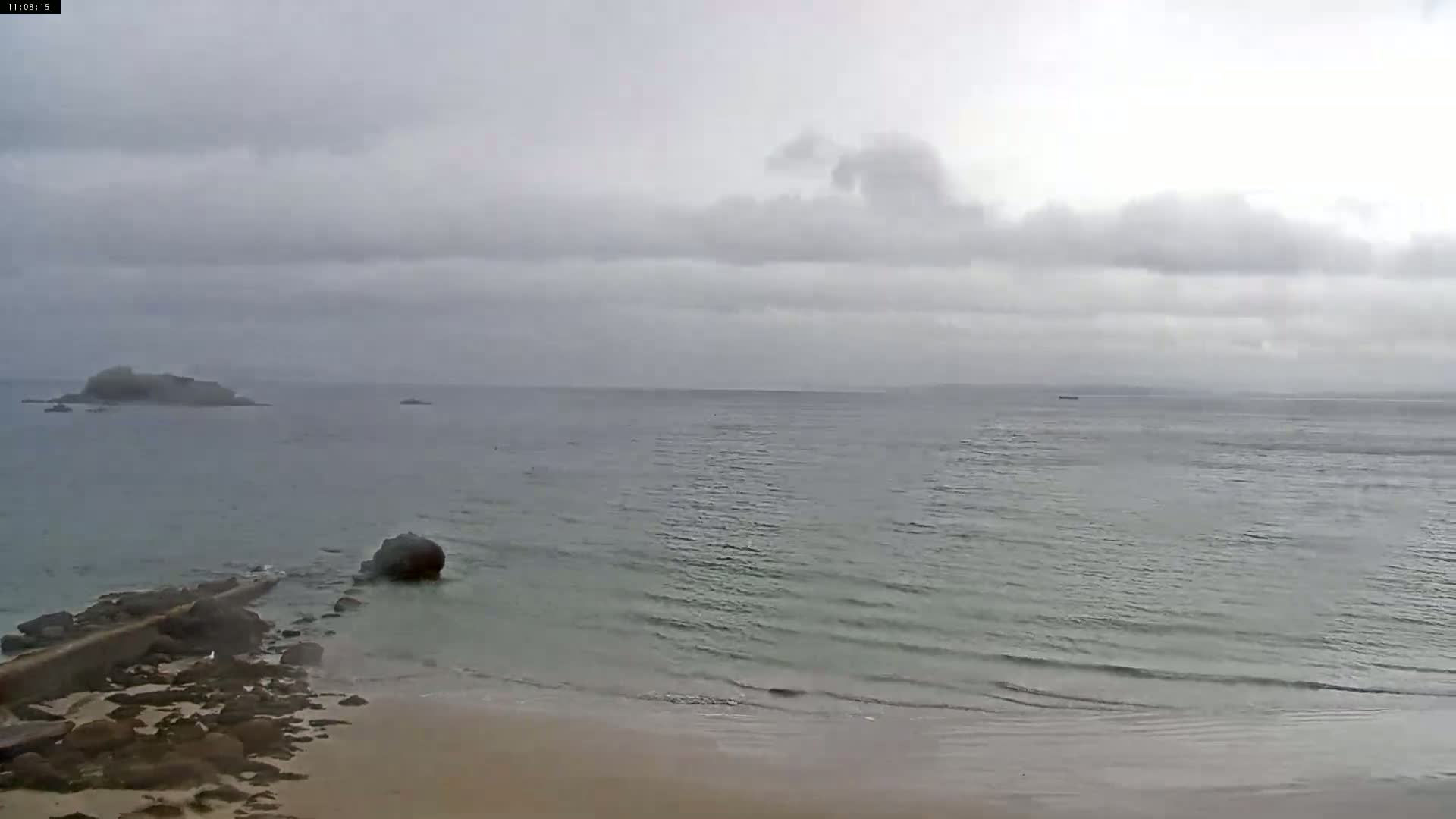 A wet, overcast day shows a rocky shoreline with a small island visible in the distance across a calm sea.