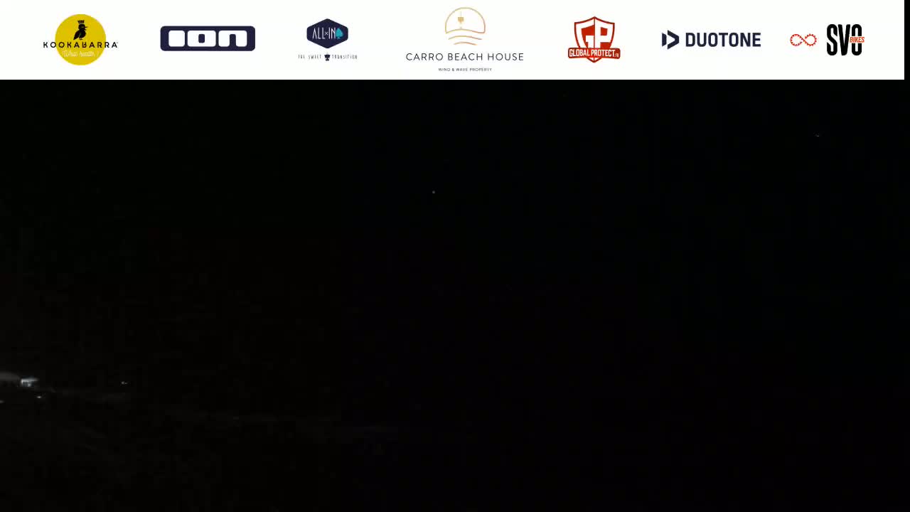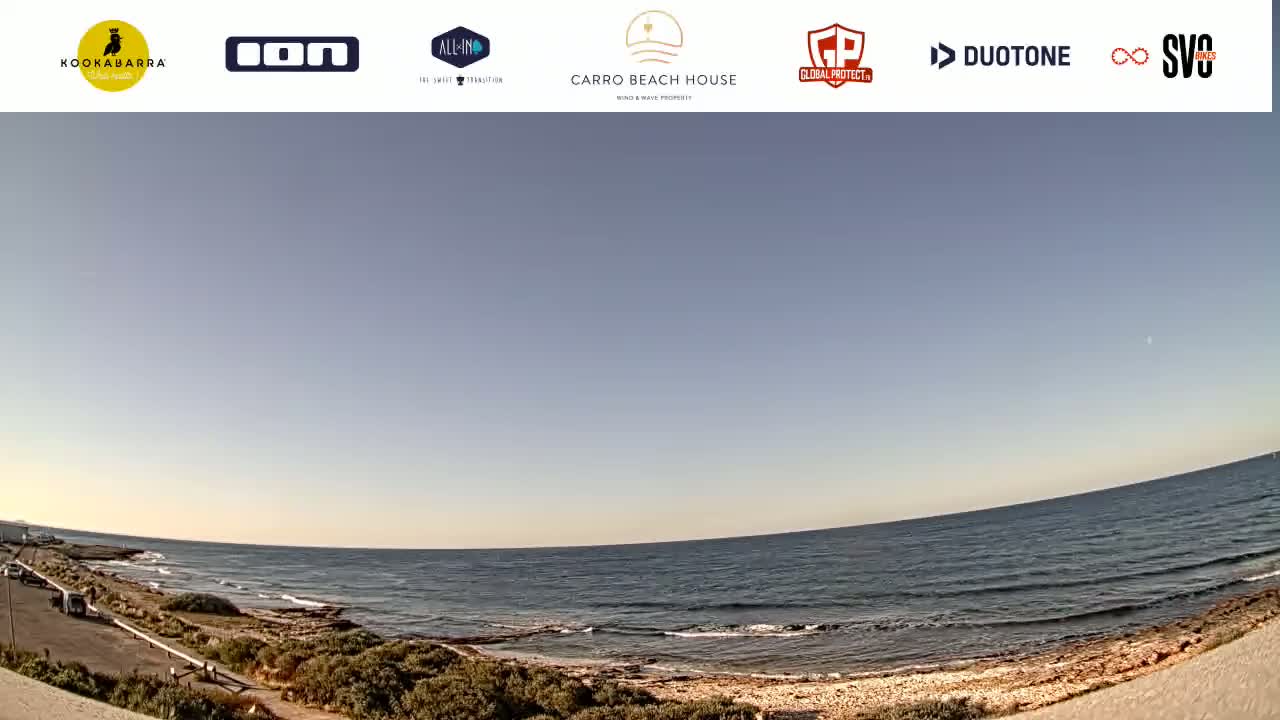 A mostly sunny day at a beach shows a calm sea with people swimming and relaxing on the shore, with a parking lot and vegetation visible in the foreground.