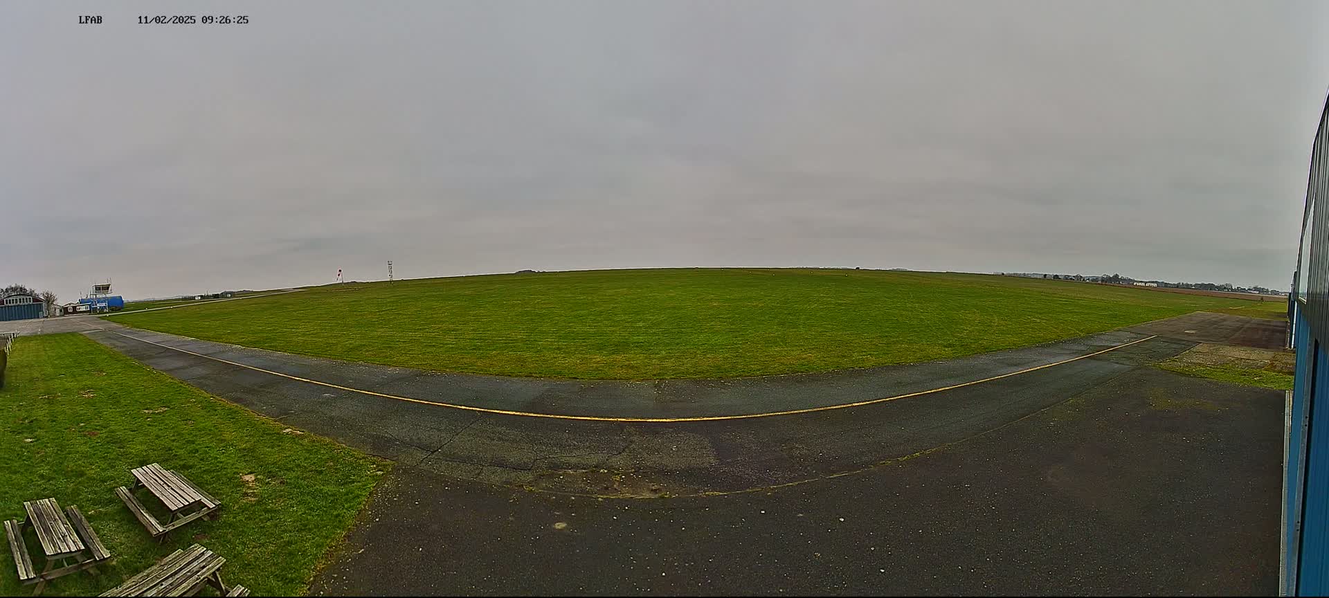 A mostly sunny day reveals a grassy airfield with a paved taxiway curving to the right, a picnic table sits in the grass, and a section of a blue building is visible in the bottom right corner.