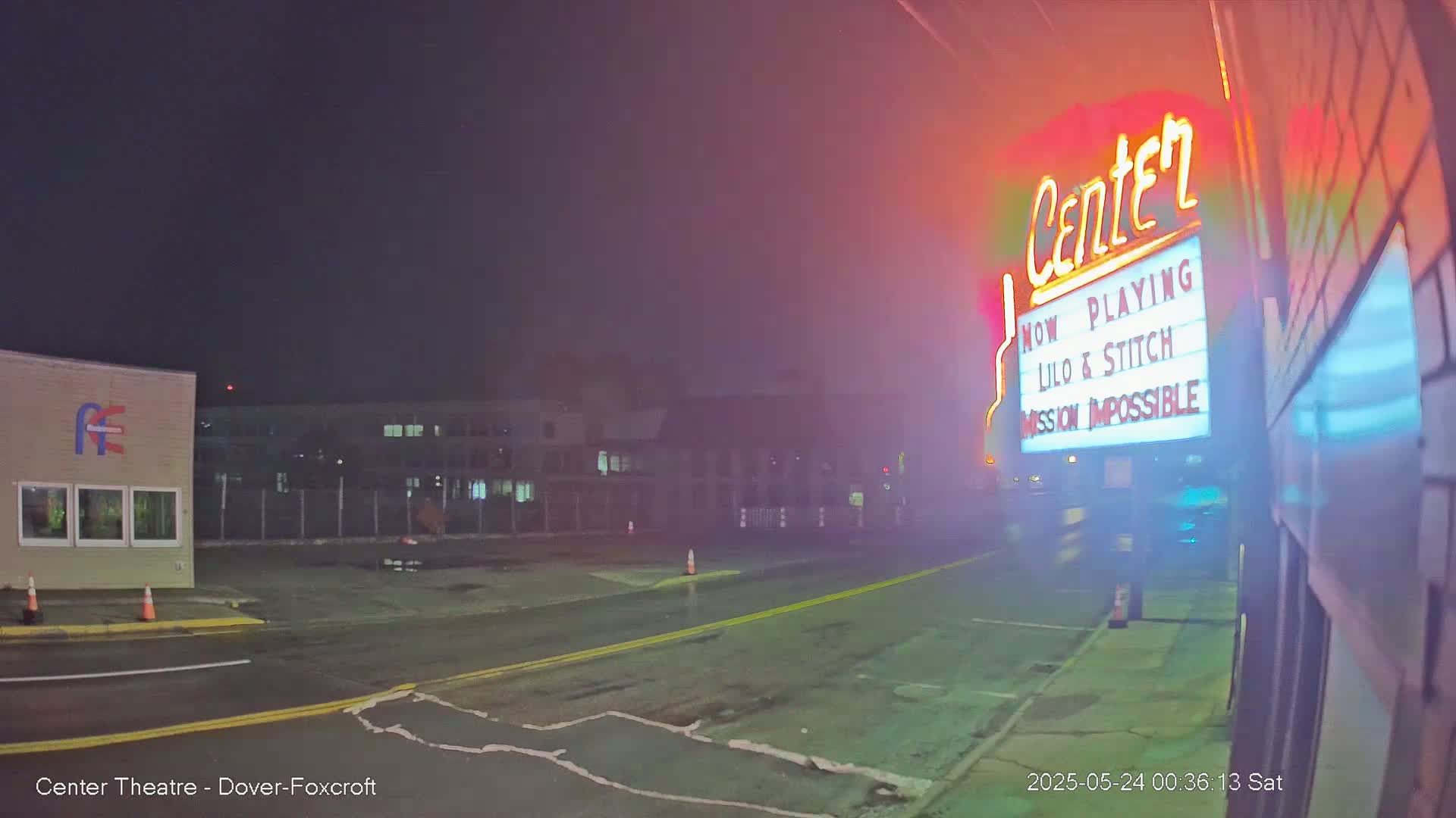 A nighttime street scene shows a movie theater marquee advertising "Naked Gun" and "Freaker Friday," with a mostly empty street and buildings visible in the background under a dark sky.