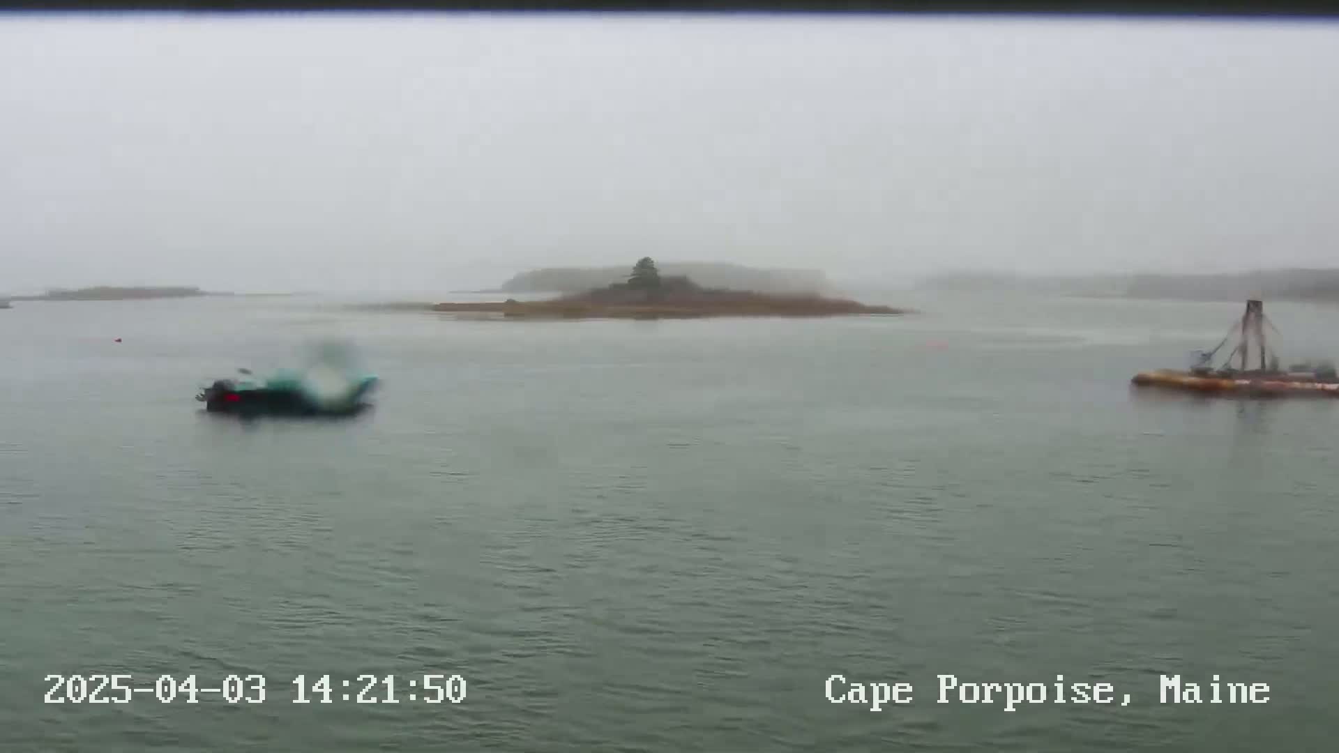 A construction crane and several boats are visible in a harbor on an overcast and rainy day.