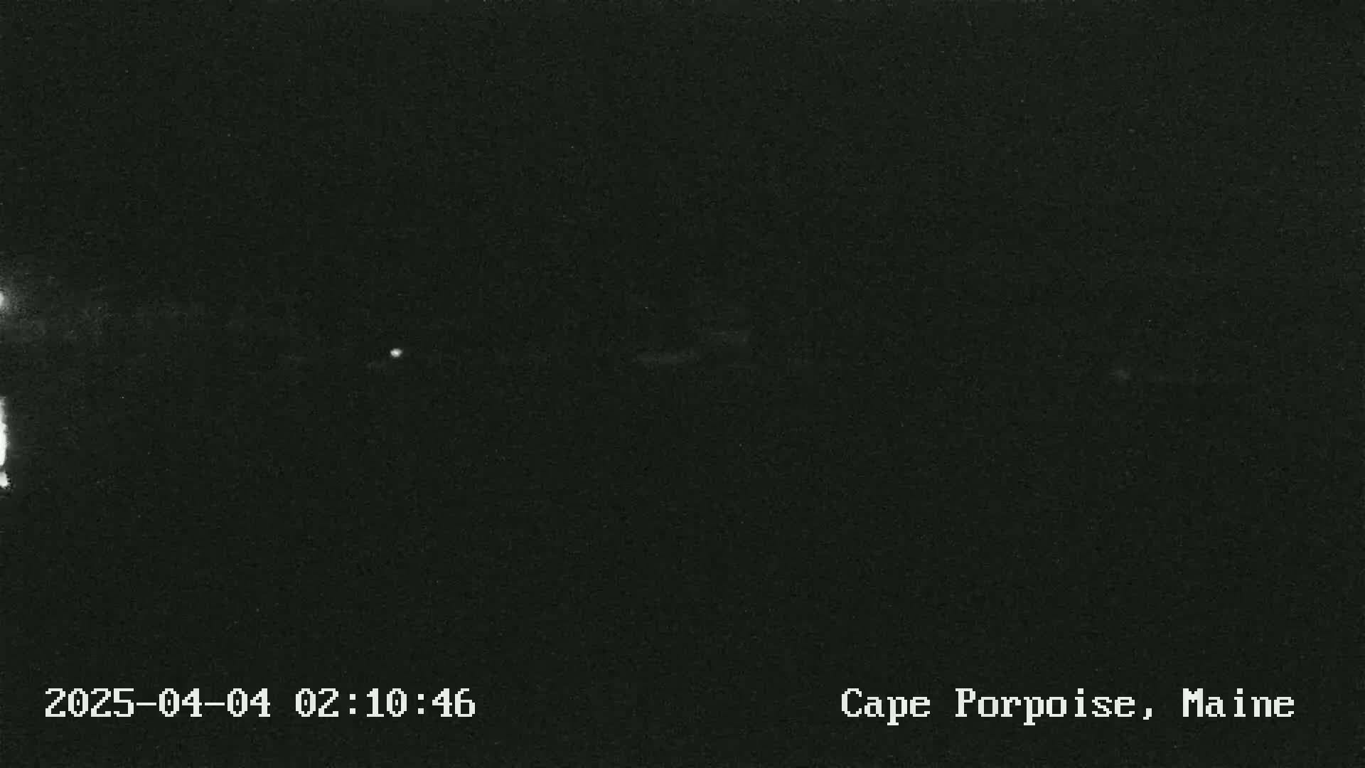 A nighttime, low-light image shows a dark, possibly water-based scene with a few faint, distant lights.