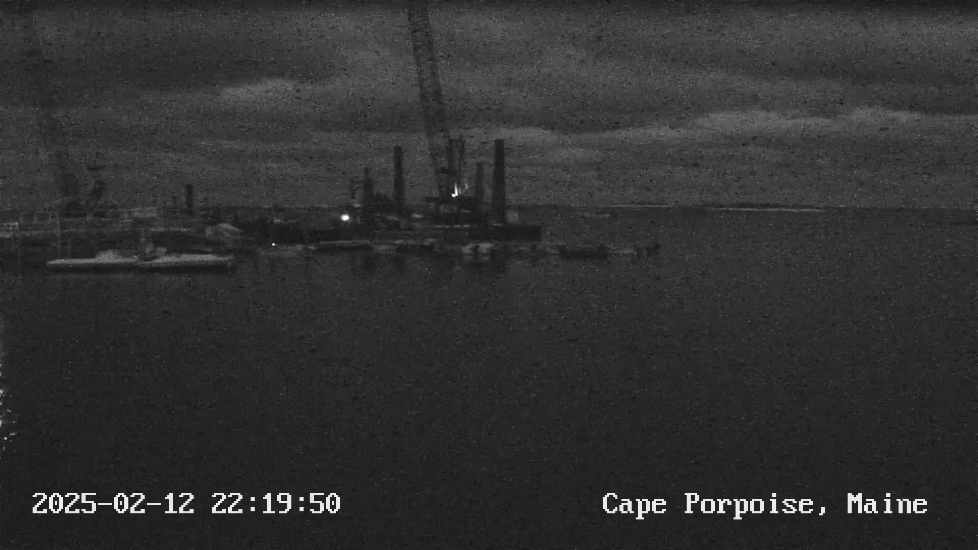 A calm, dusky-lit harbor scene shows a construction crane and several boats moored at a dock, with exposed mudflats at low tide.