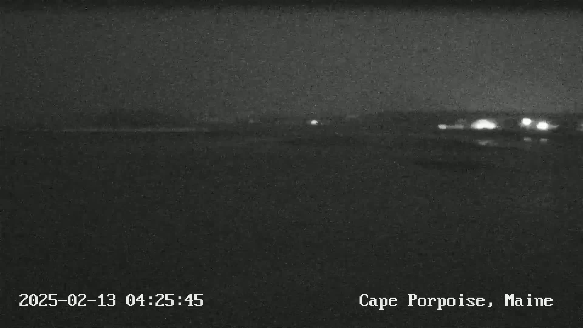 A nighttime, low-light view of a dark body of water with a distant shoreline showing faint lights.