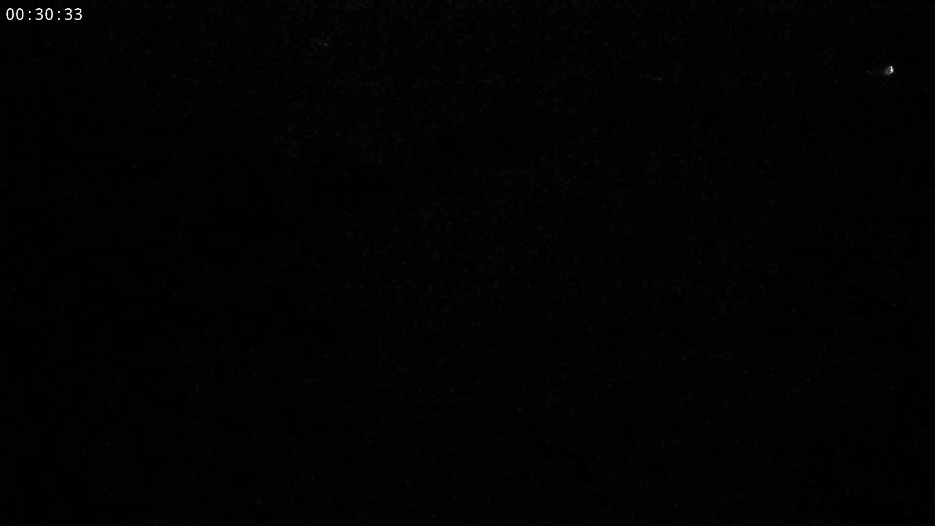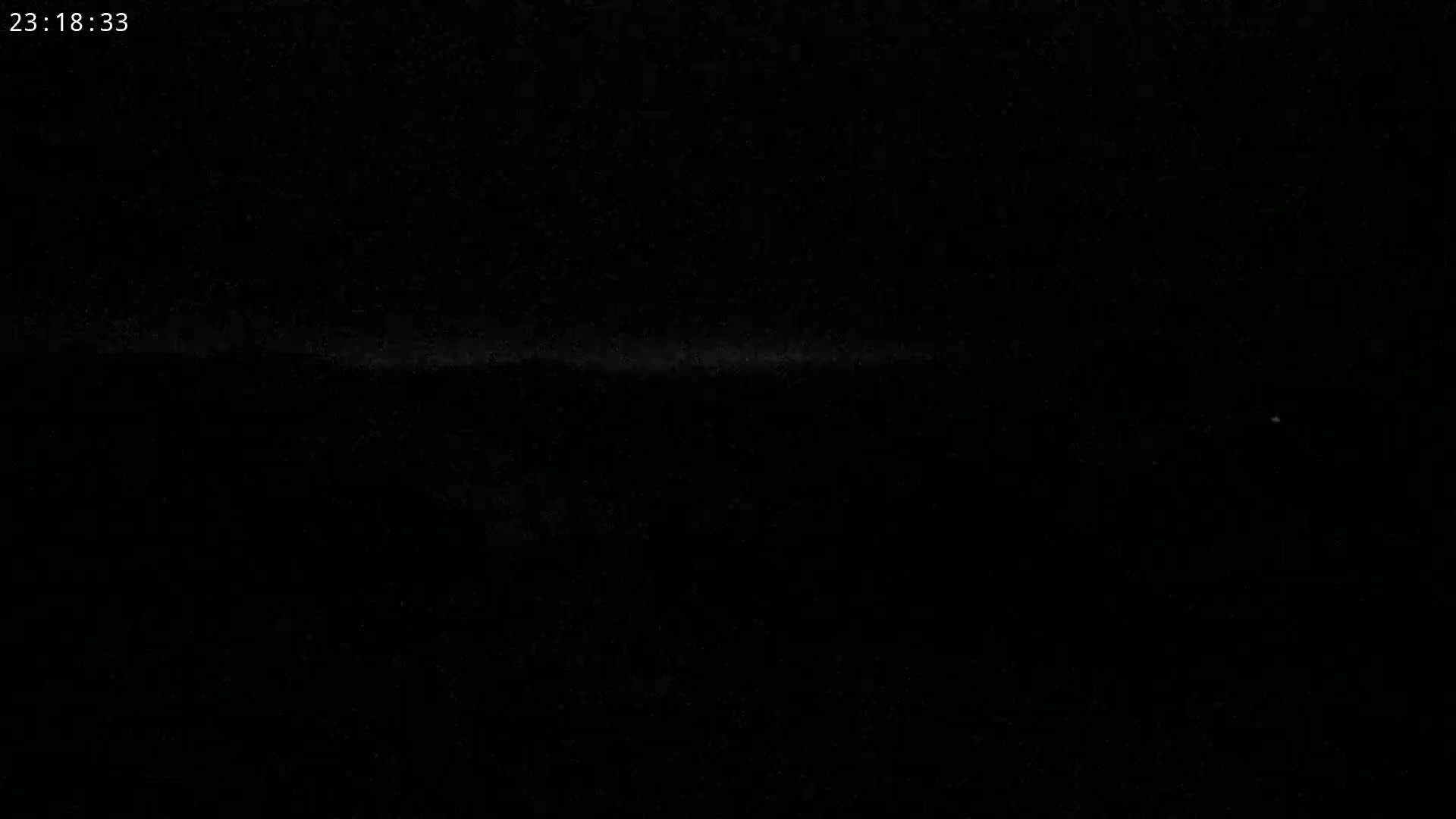 A nighttime, low-light image shows a faint line of lights on the horizon.