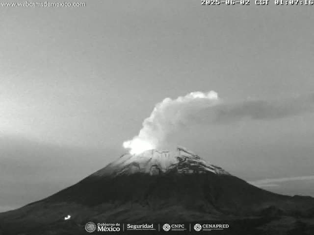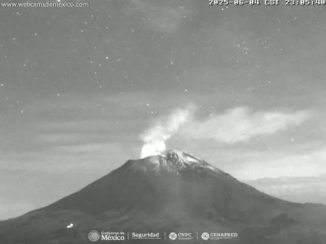 A grayscale night vision image displays a dark volcano actively emitting a bright plume of gas under a clear, starry night sky.