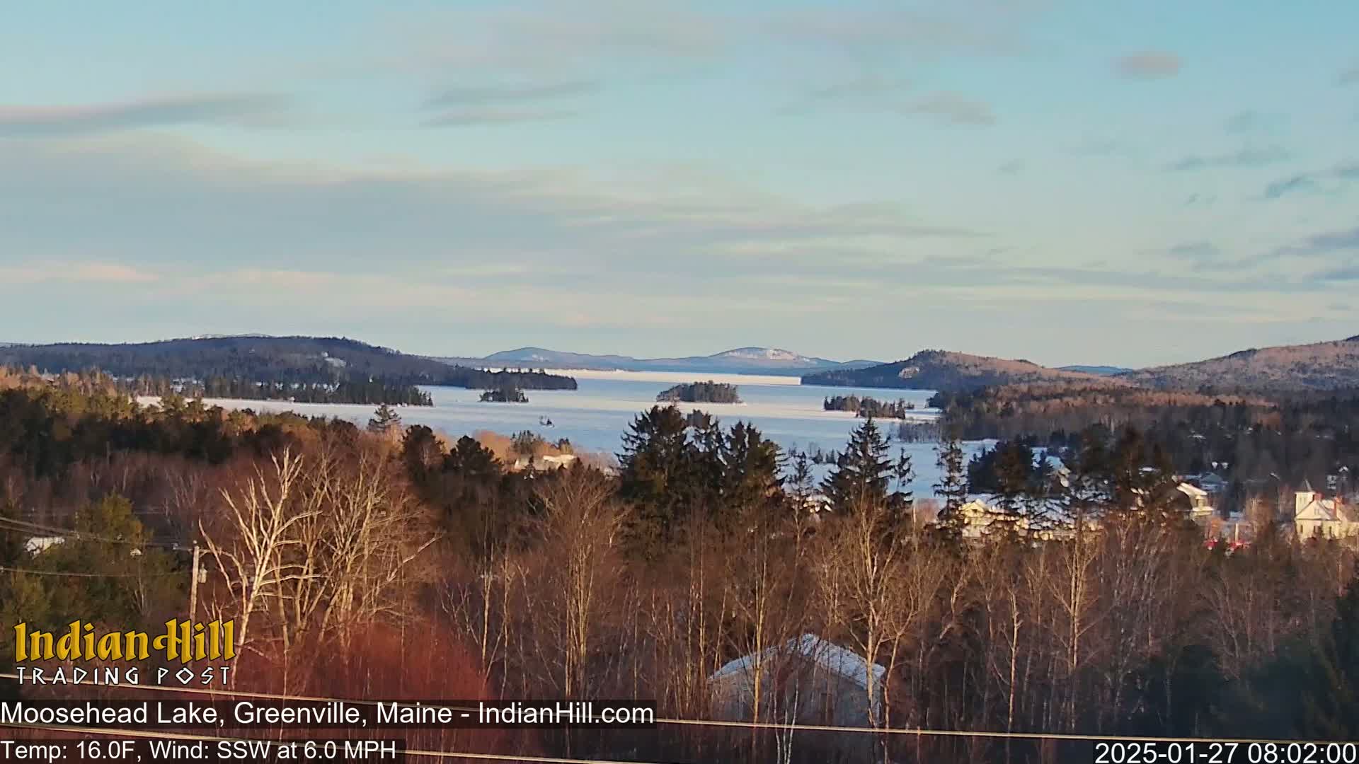 A snow-covered lake stretches to the horizon under a partly cloudy sky, viewed from a wooded hillside with a light northwest wind.