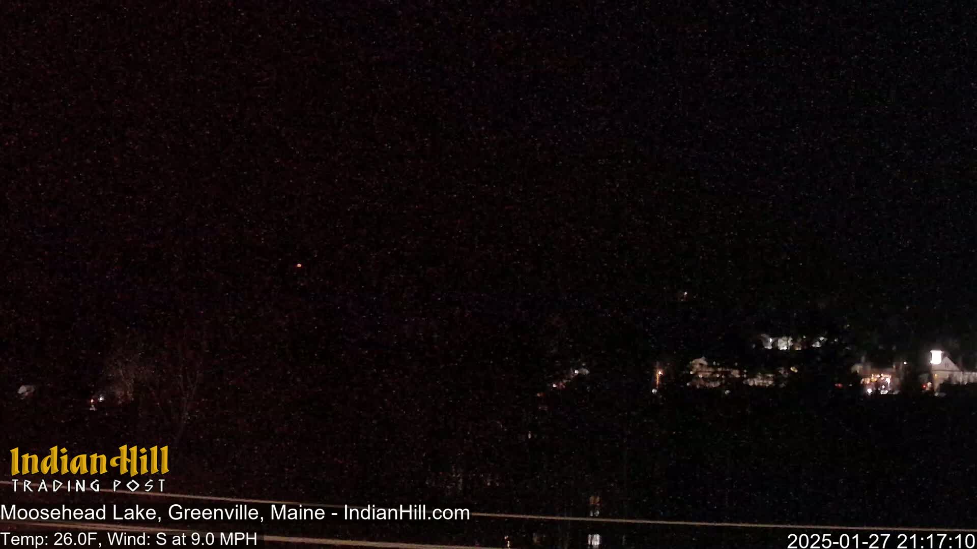 A nighttime, dark view of a landscape with a few distant lights under a mostly clear sky, with a light southwest wind at 3 mph and a temperature of 27 degrees Fahrenheit.