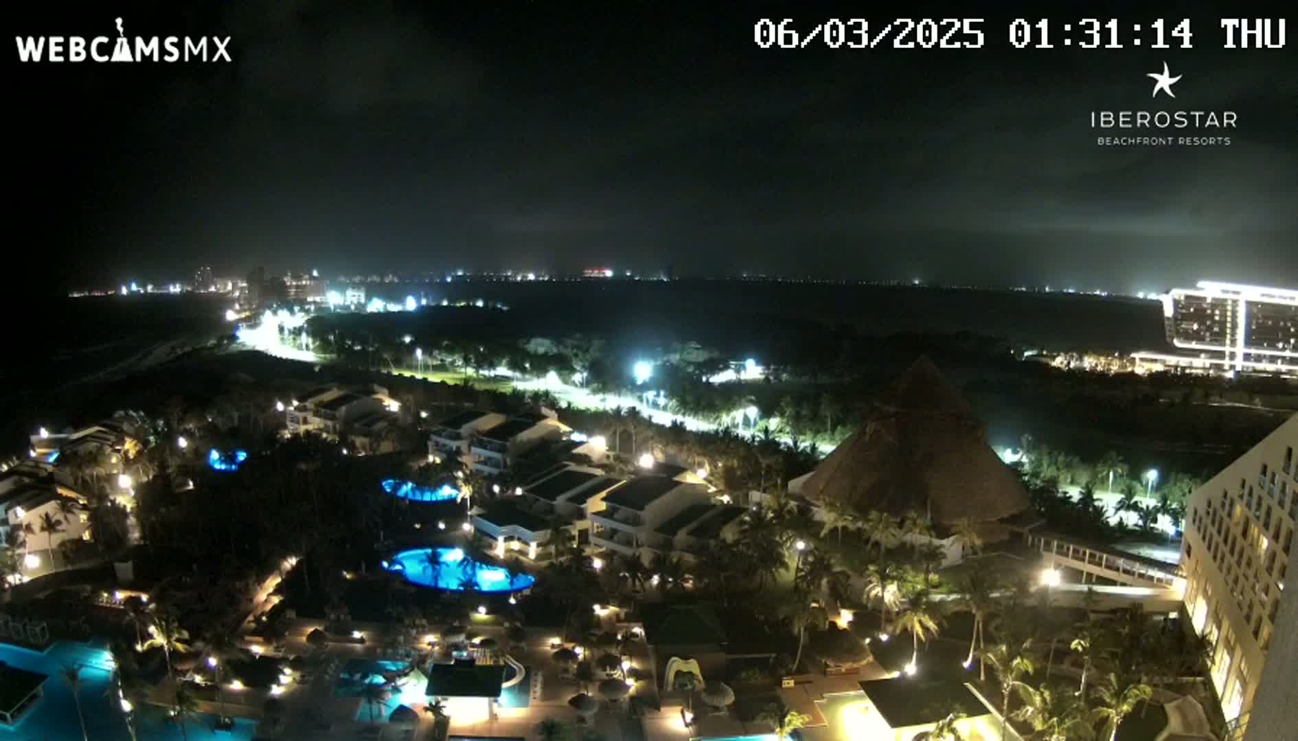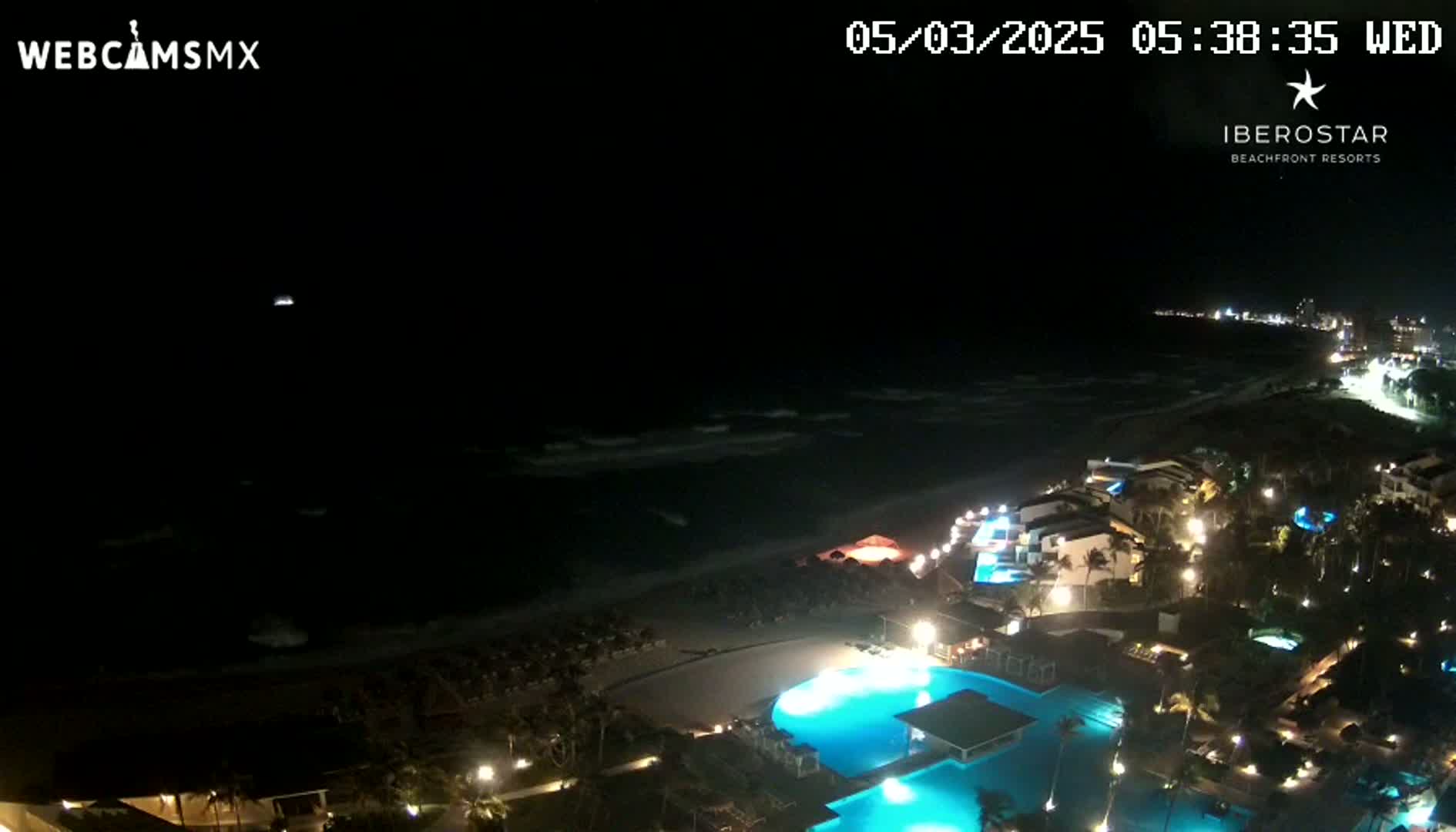 A nighttime, high-angle view shows a resort's illuminated swimming pools and buildings next to a dark ocean with small waves under a mostly clear night sky.