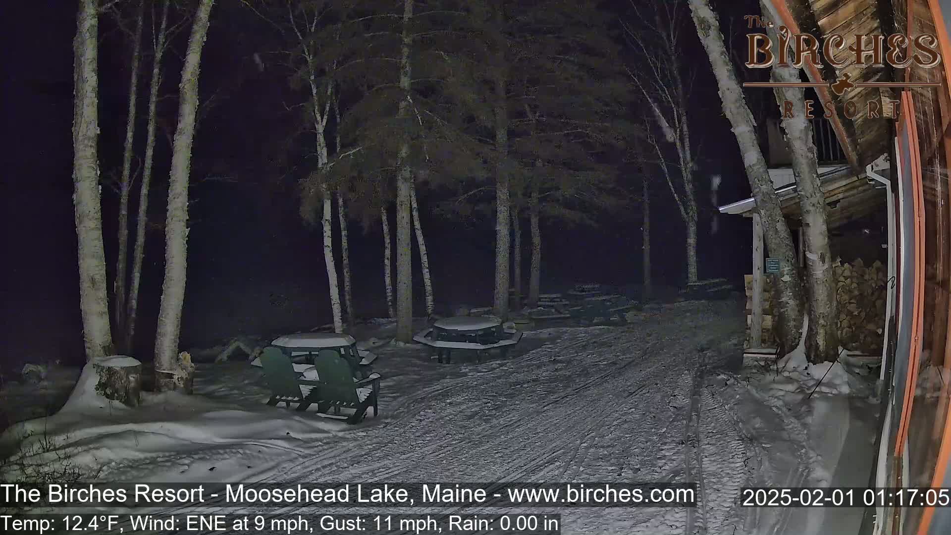A nighttime, rainy scene shows a sparsely lit area with several birch trees, some outdoor furniture, and a portion of a building.