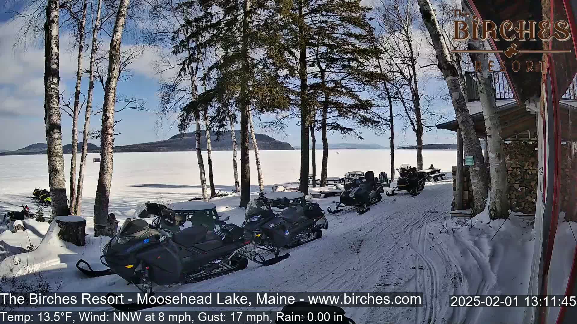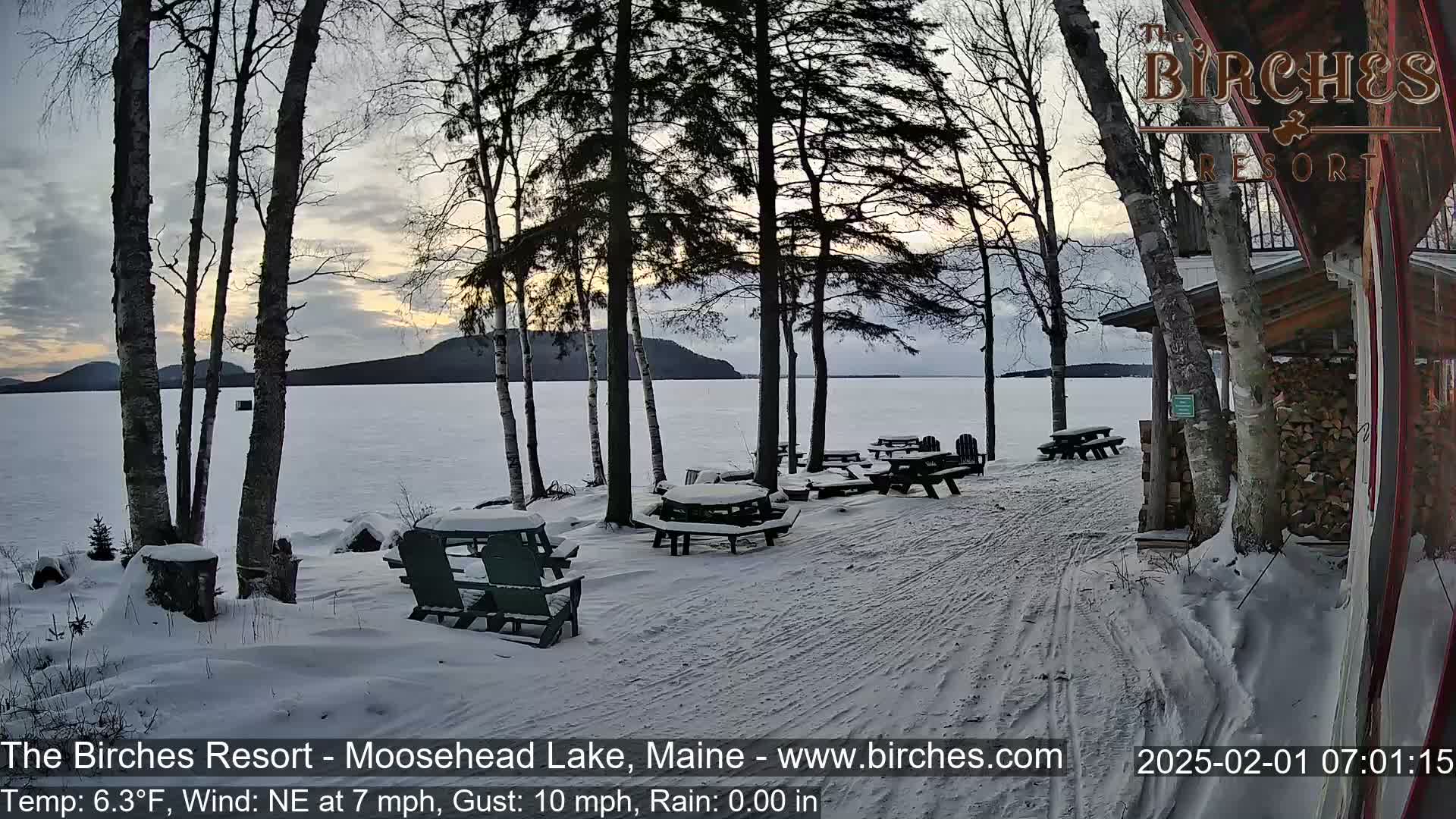 Several picnic tables sit on a lakeside patio under a sunny sky, partially obscured by birch and pine trees.