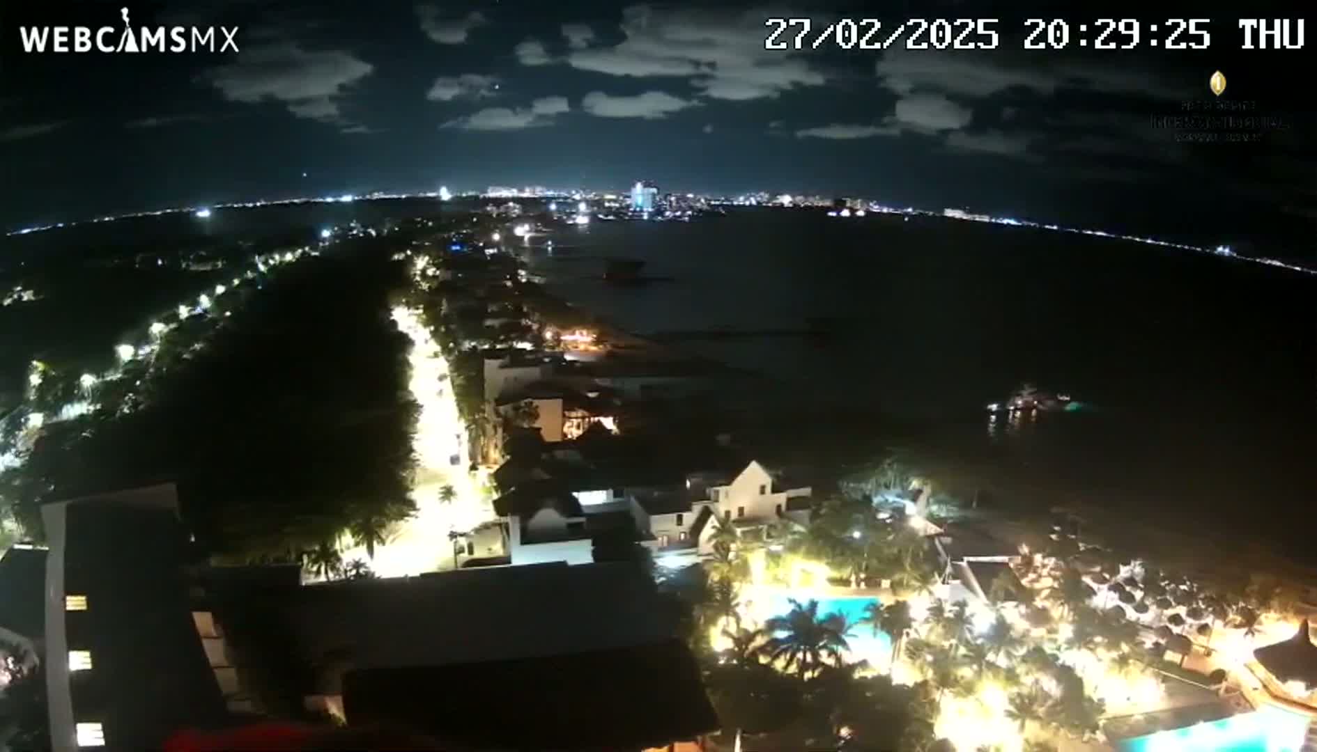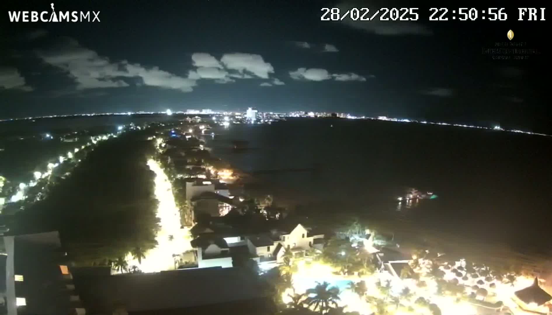 A nighttime aerial view shows a city's illuminated coastline, a resort with pools, and a dark ocean under a partly cloudy sky.