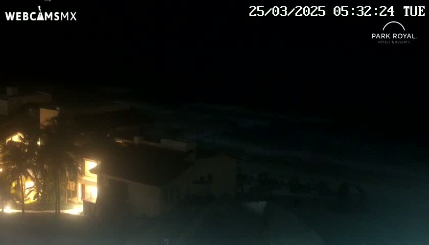 A nighttime view shows a dark ocean and dimly lit buildings.
