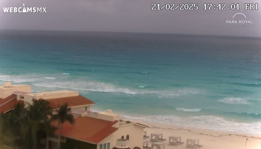 A sunny day shows a beach with turquoise water, small waves, and several beach cabanas, next to a resort with red-tiled roofs and palm trees.