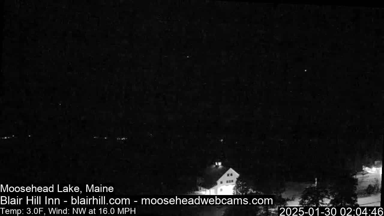 A nighttime, low-light view of a building near a lake with a northwest wind at 5 mph and a temperature of 12°F.