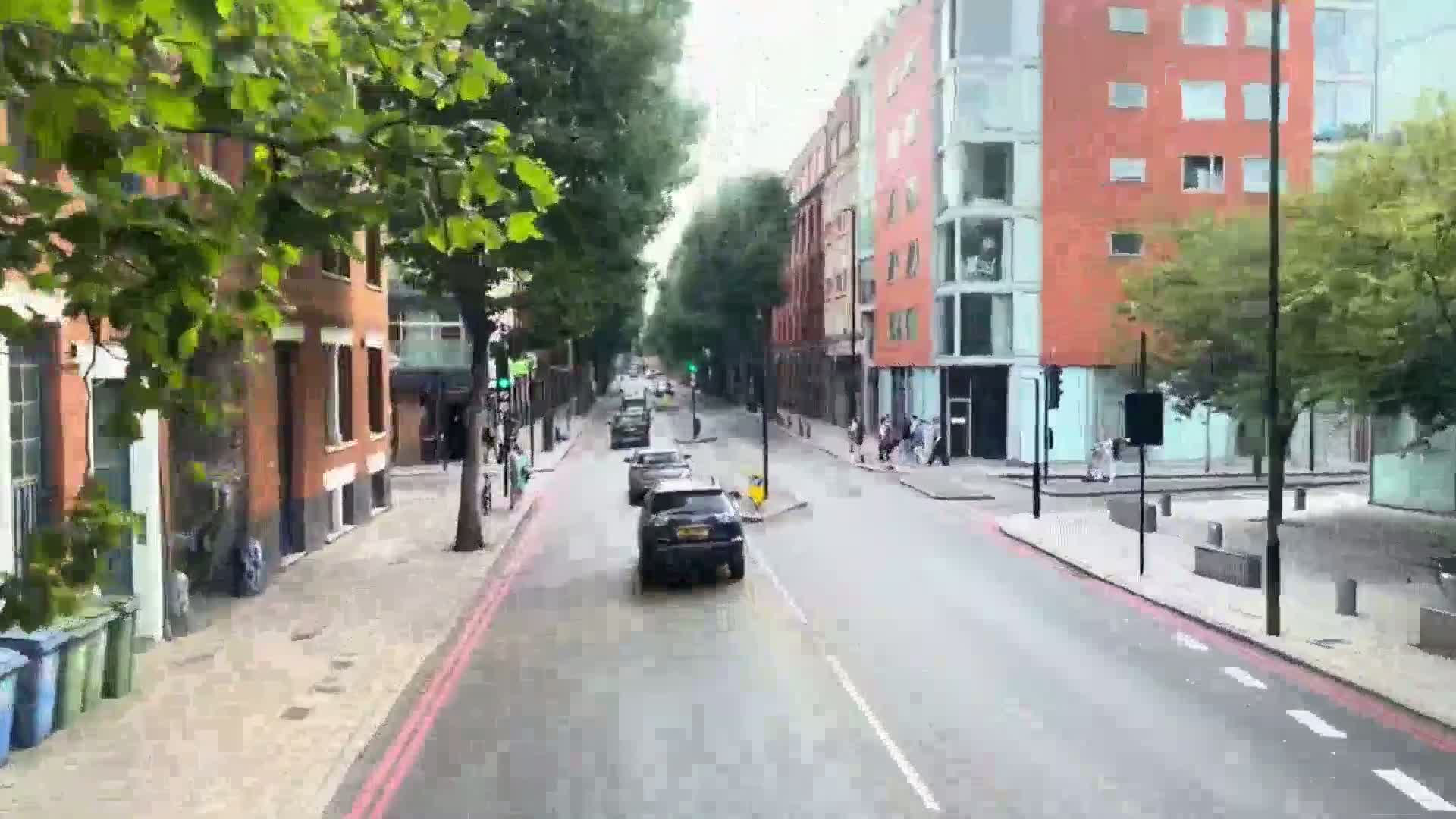 A city street scene on a bright, clear day shows a red double-decker bus stopped at a traffic light, pedestrians walking on the sidewalk, and cyclists riding in the street.
