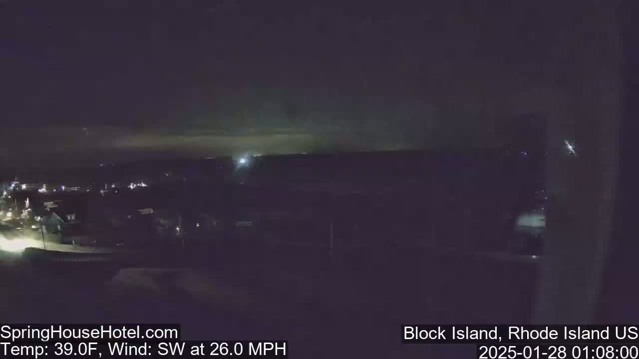 A nighttime view of a suburban area near a body of water under a dark sky with a 36°F temperature and a 6.0 mph southwest wind.