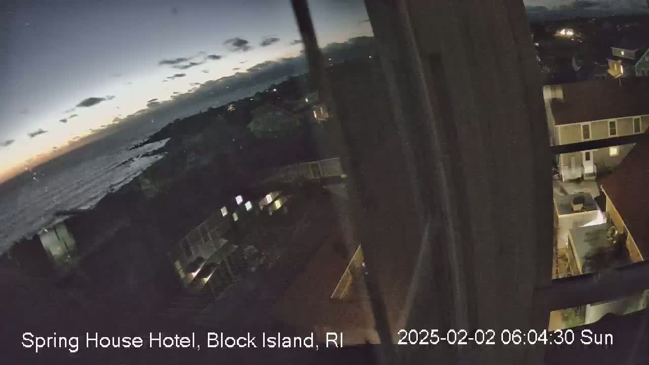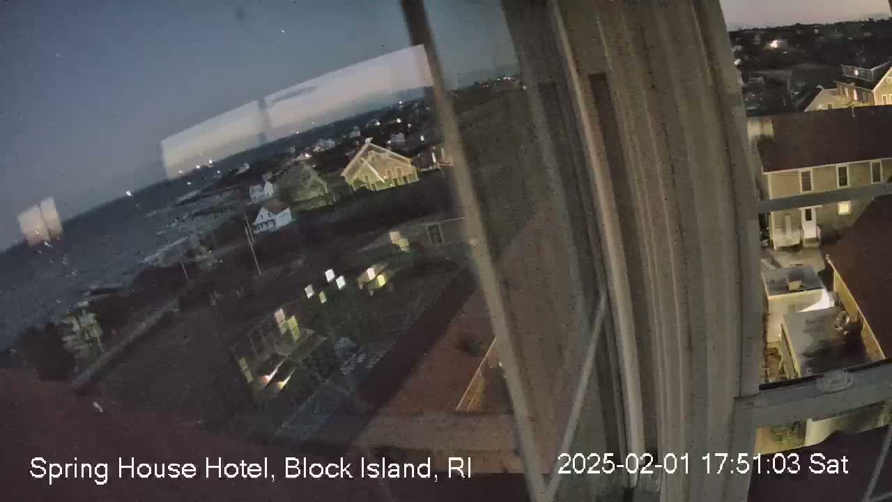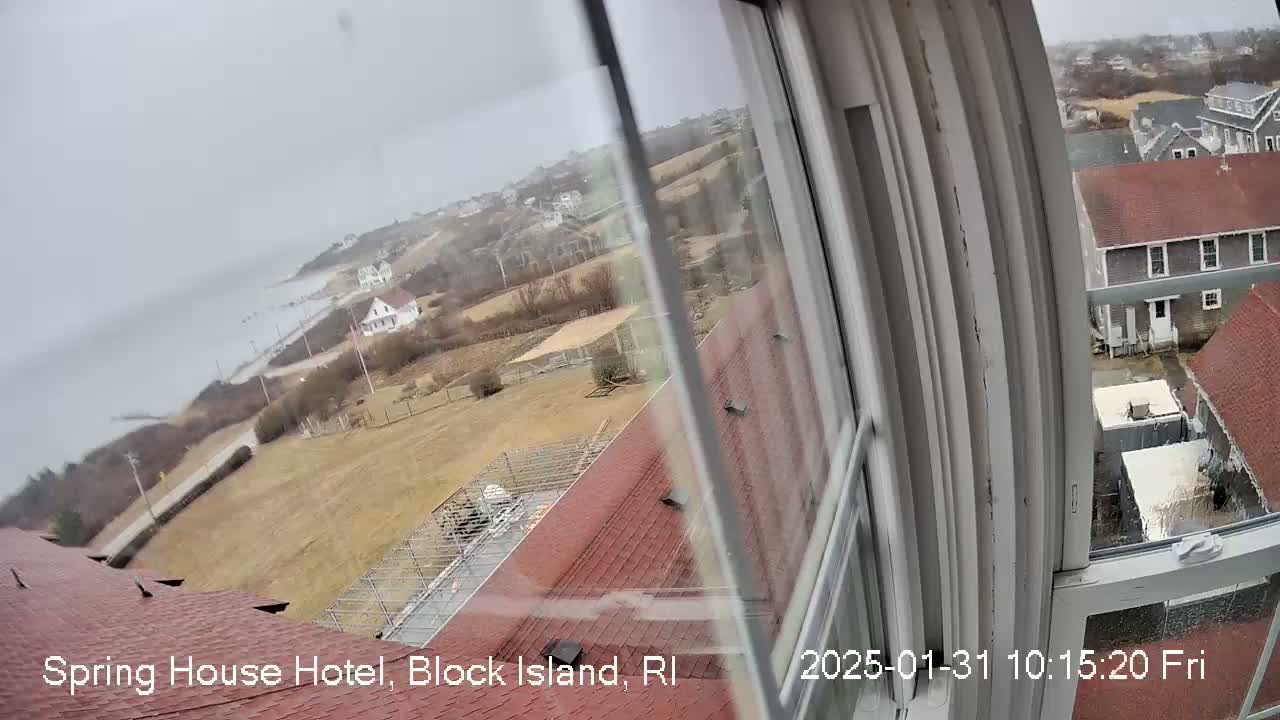 A view from a window shows a coastal scene with overcast skies, featuring a red-roofed building, other buildings, a body of water, and sparsely vegetated land.