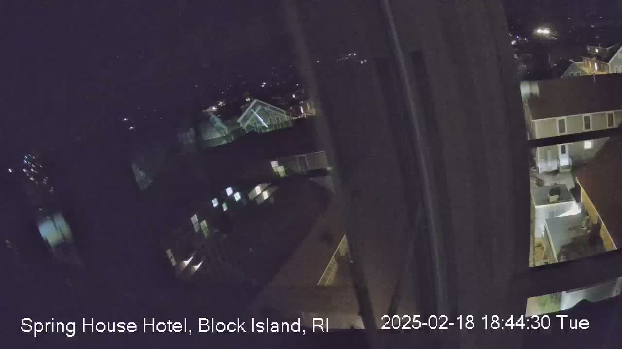 A nighttime, high-angle view from a window shows a residential area with dimly lit buildings and yards.