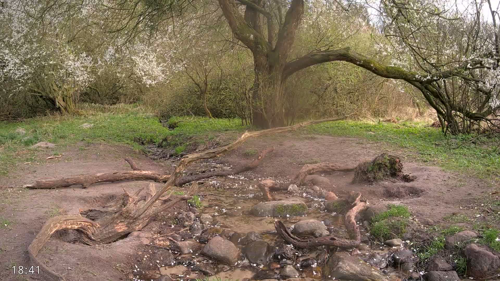 A muddy, rocky stream flows through a dense, wild woodland featuring a prominent tree with a long mossy branch and mixed green and barren undergrowth, under an overcast sky.
