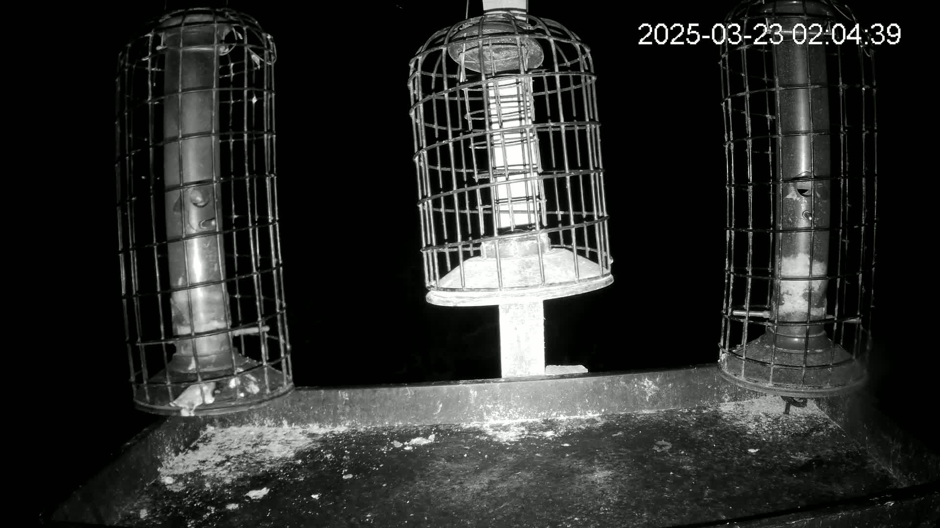 Three caged bird feeders hang from tree branches in a leafy, wooded area.