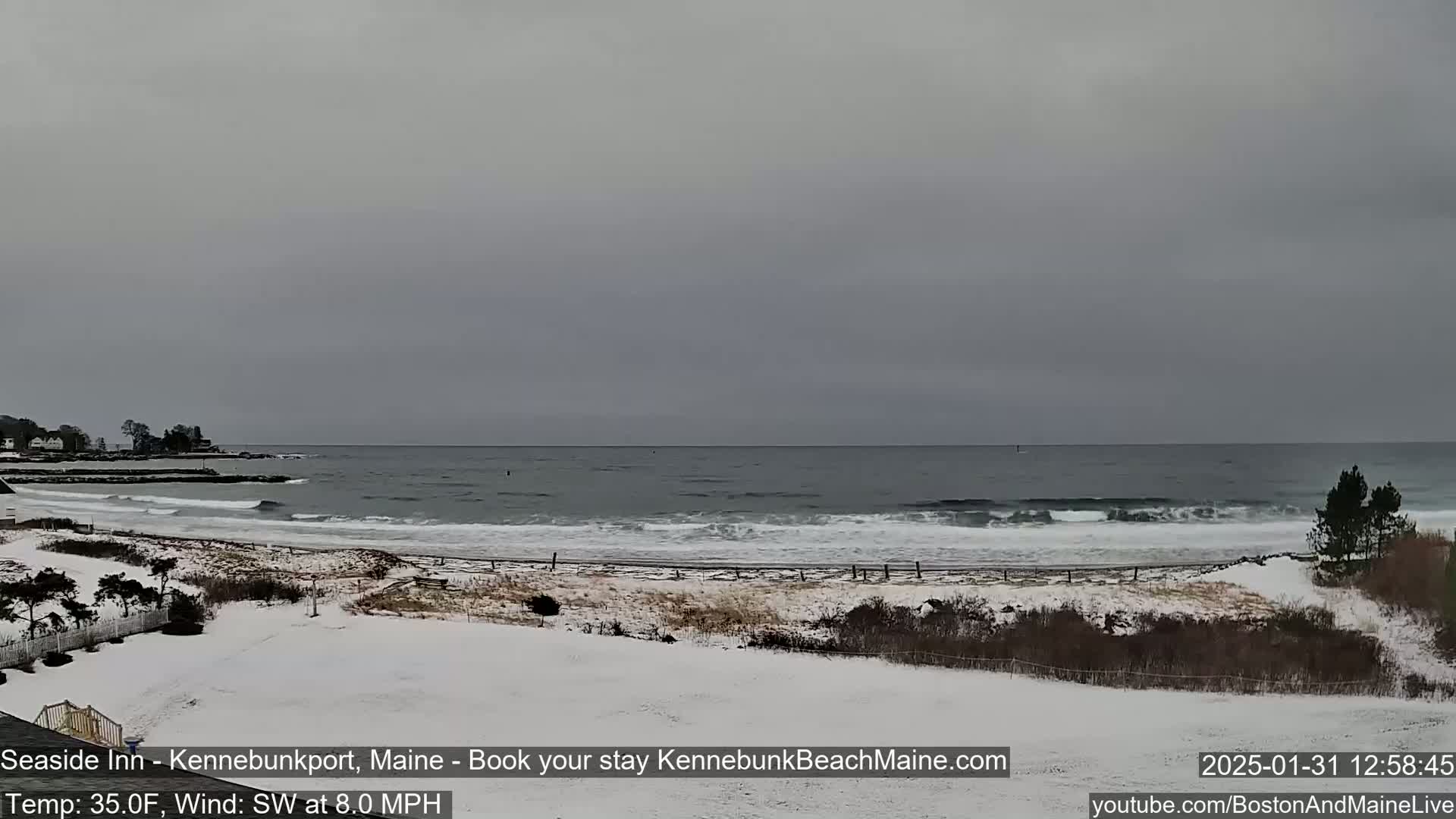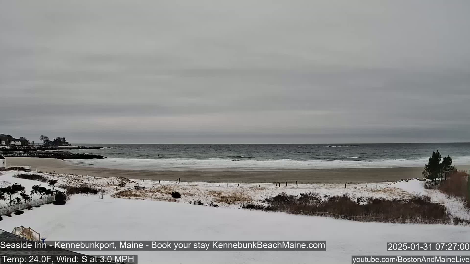 A foggy, calm beach scene is visible from a grassy area, with a glimpse of the ocean in the distance.
