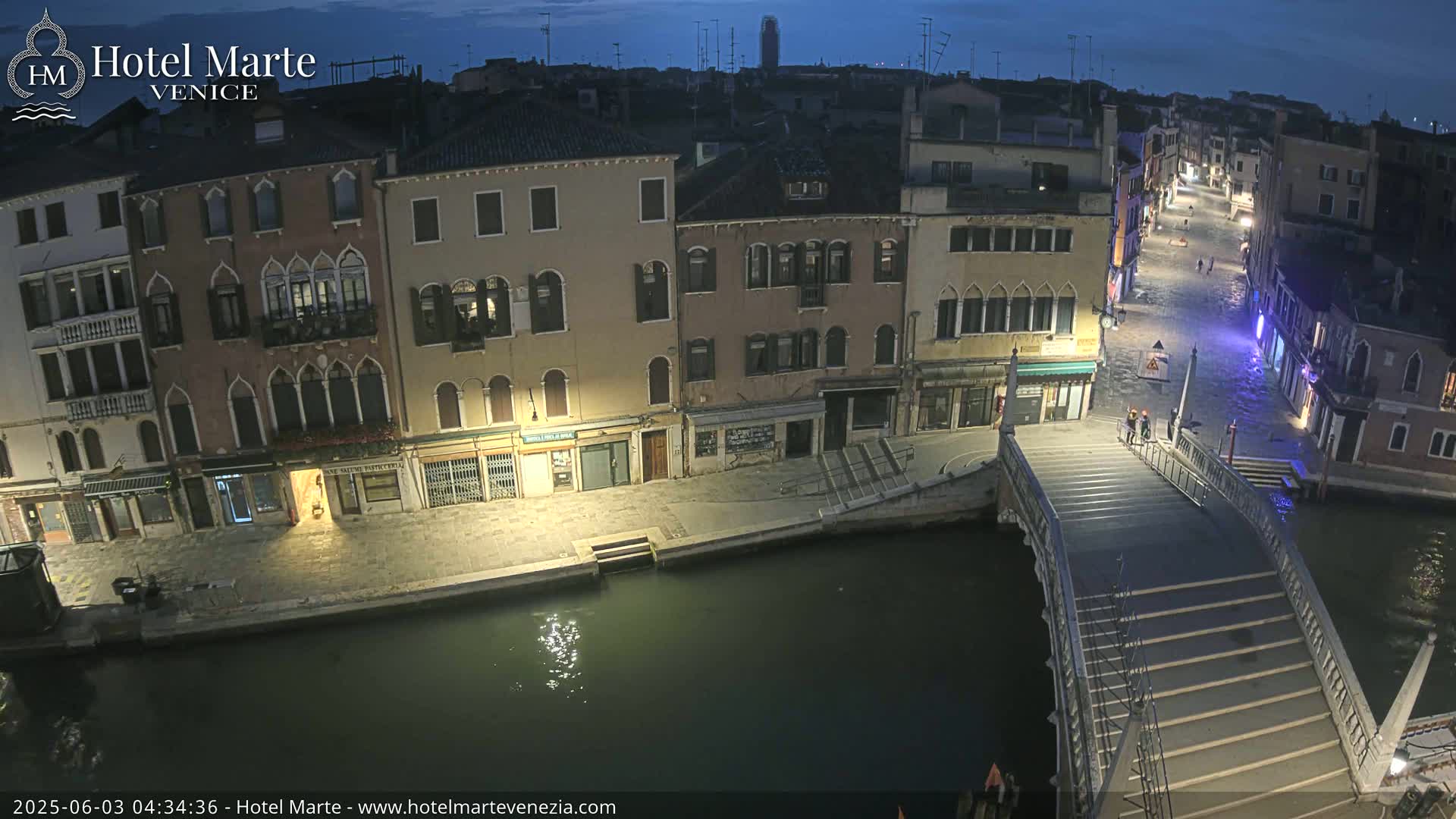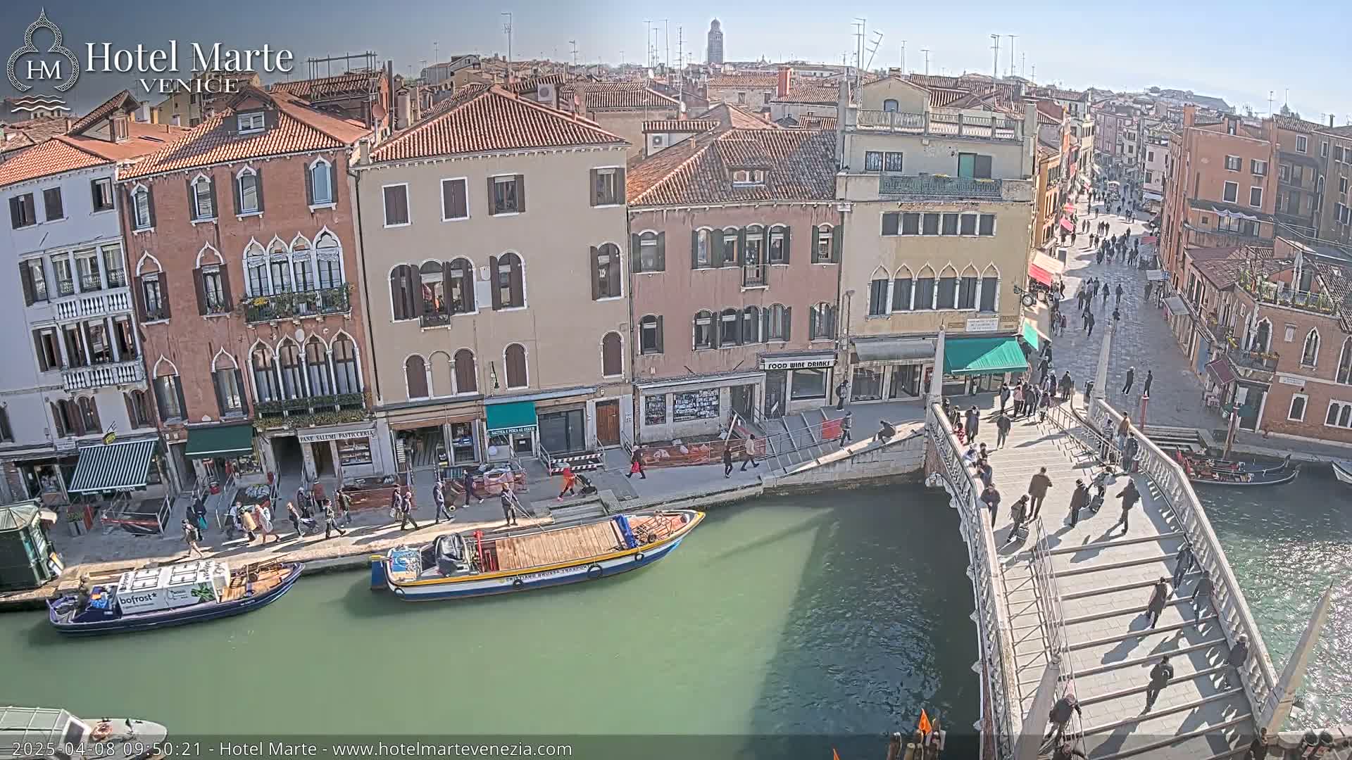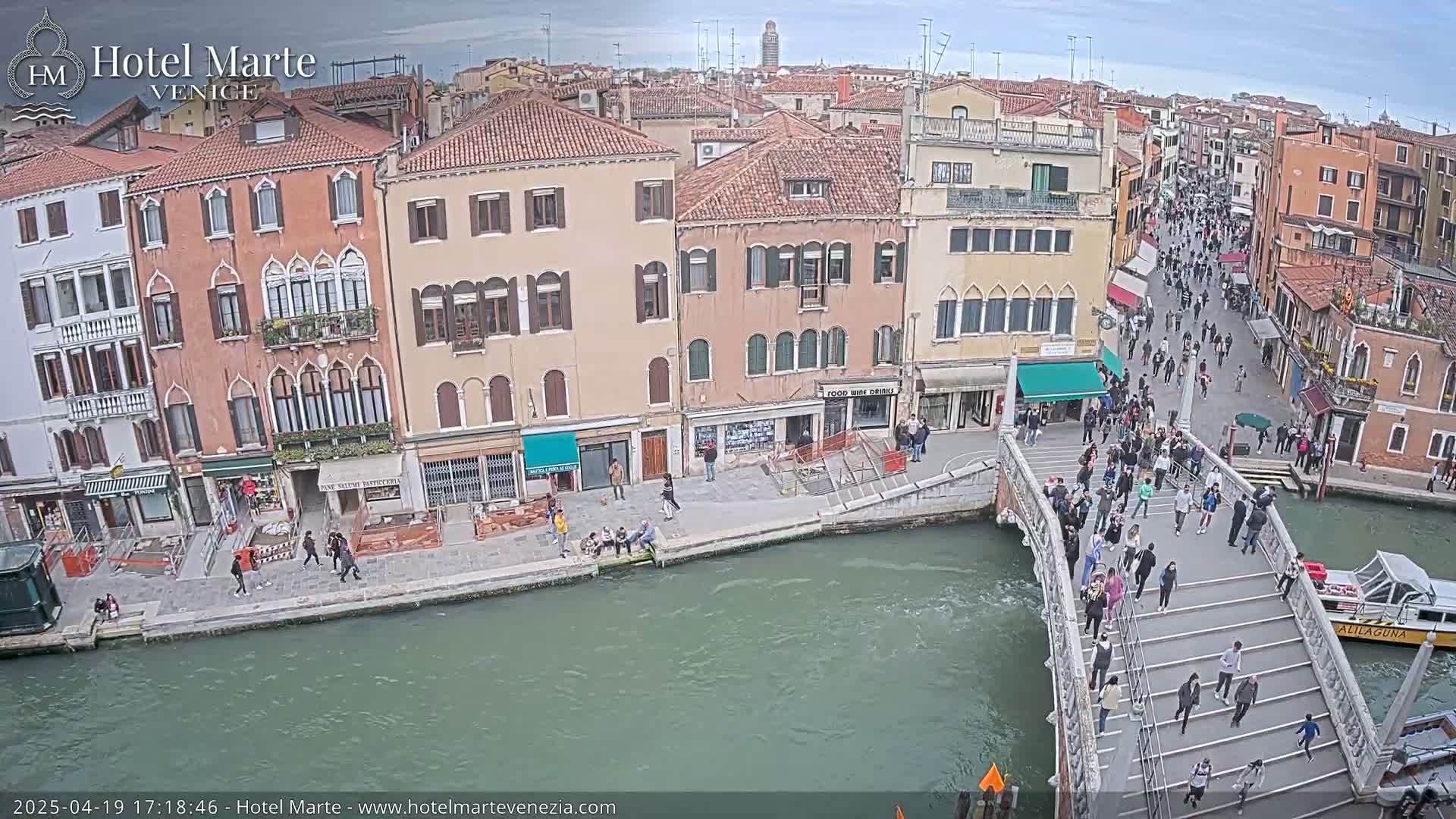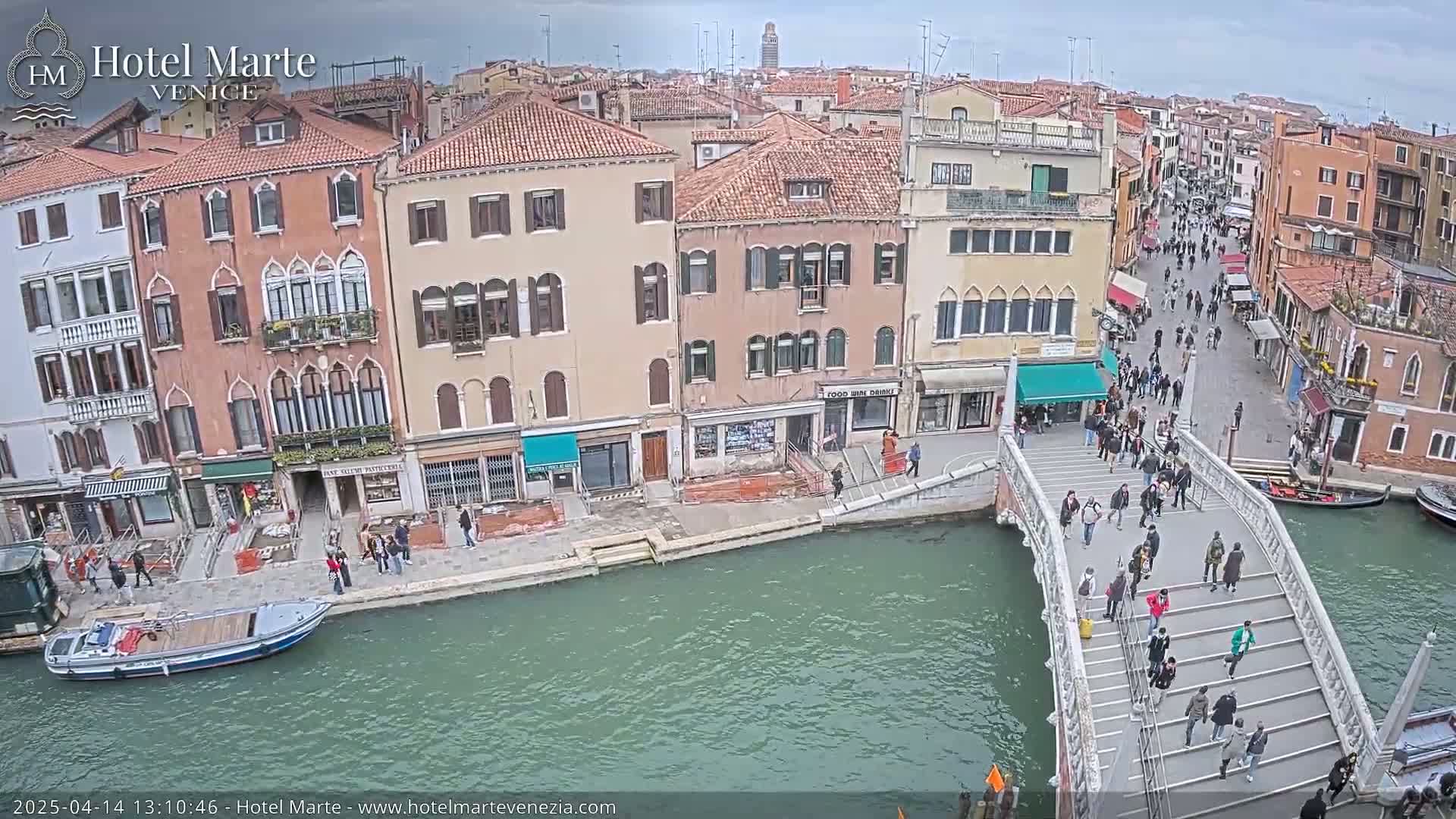 A bustling view of Venice on an overcast day shows people crossing a large pedestrian bridge over a teal-colored canal, flanked by historic multi-story buildings and a police boat navigating the waterway.