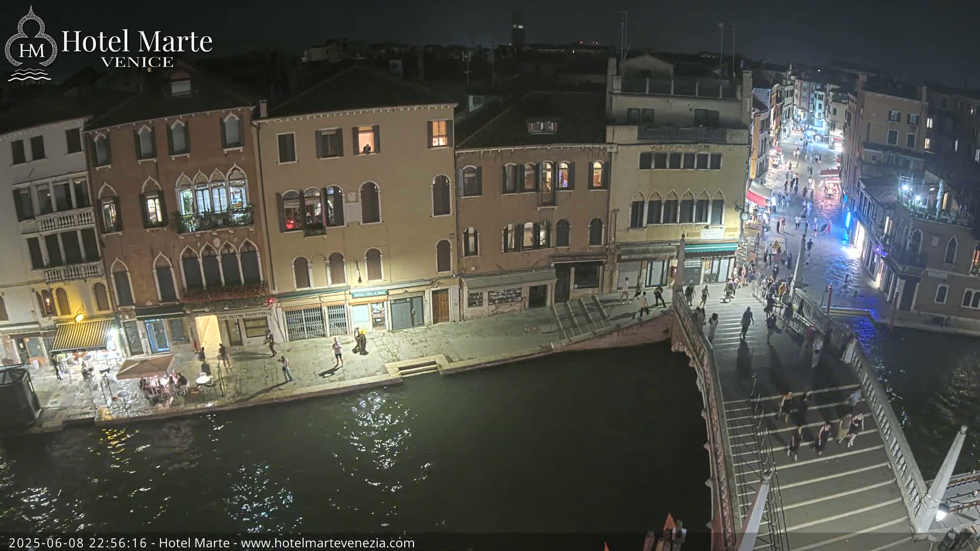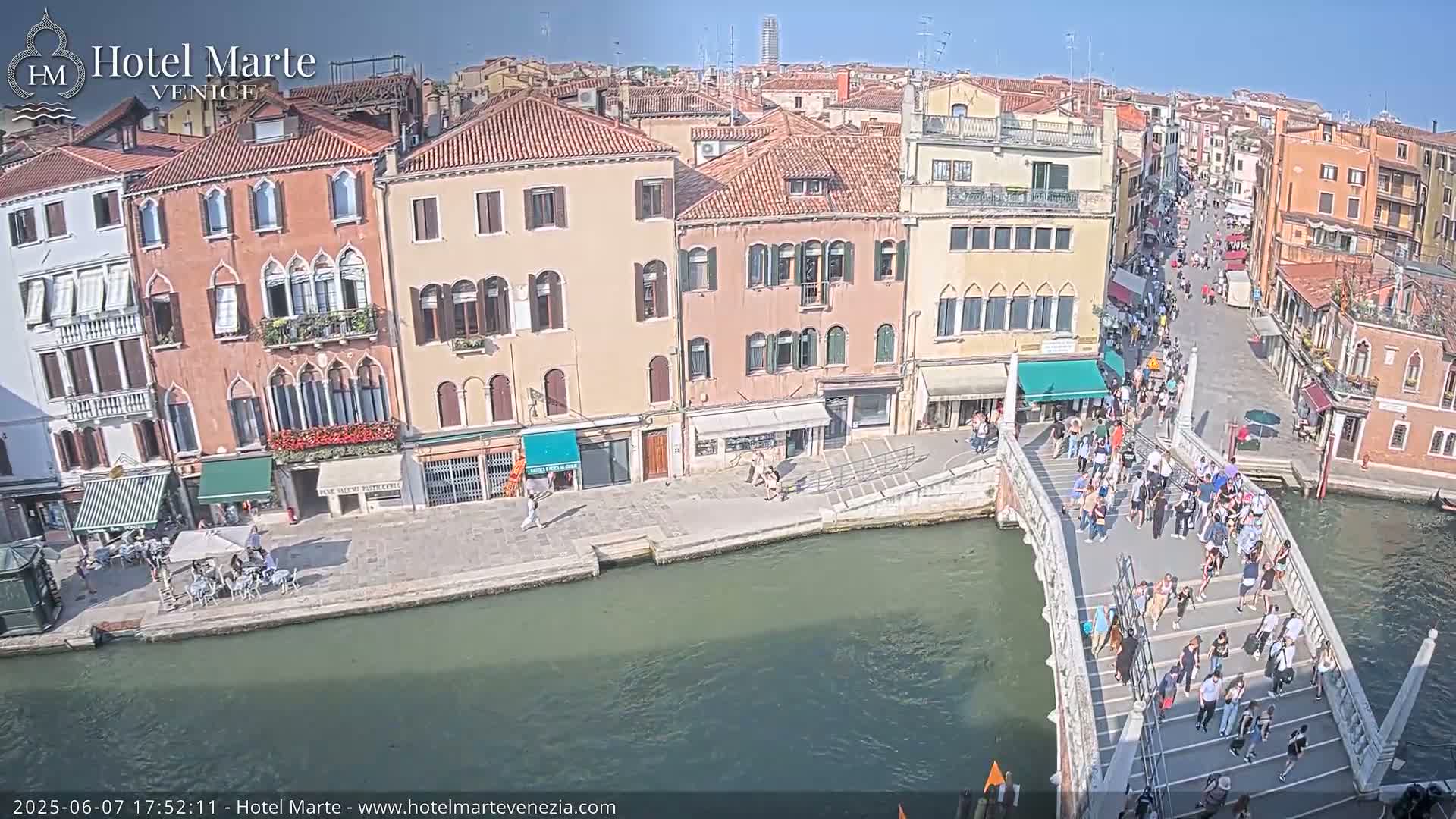 On an overcast day, a bustling canal city scene features a crowded stone bridge over a teal canal, with numerous pedestrians walking along adjacent streets lined with multi-story historic buildings, and a small boat docked along the waterway.