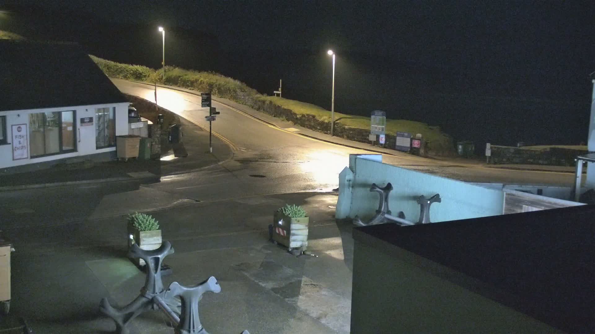 A grey, overcast day reveals a wet coastal road curving past a fish and chips shop towards a beach with crashing waves, backed by steep cliffs and distant headlands.