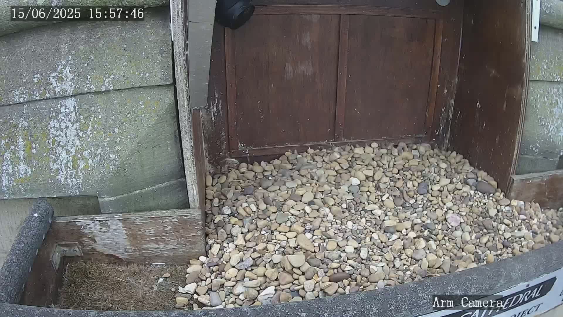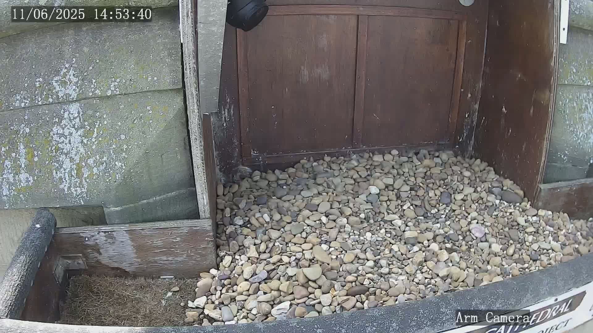 An outdoor view shows a brown, slatted nest box or ledge filled with pebbles, mounted against a dark panel and a moss-covered stone wall, under bright daylight conditions.