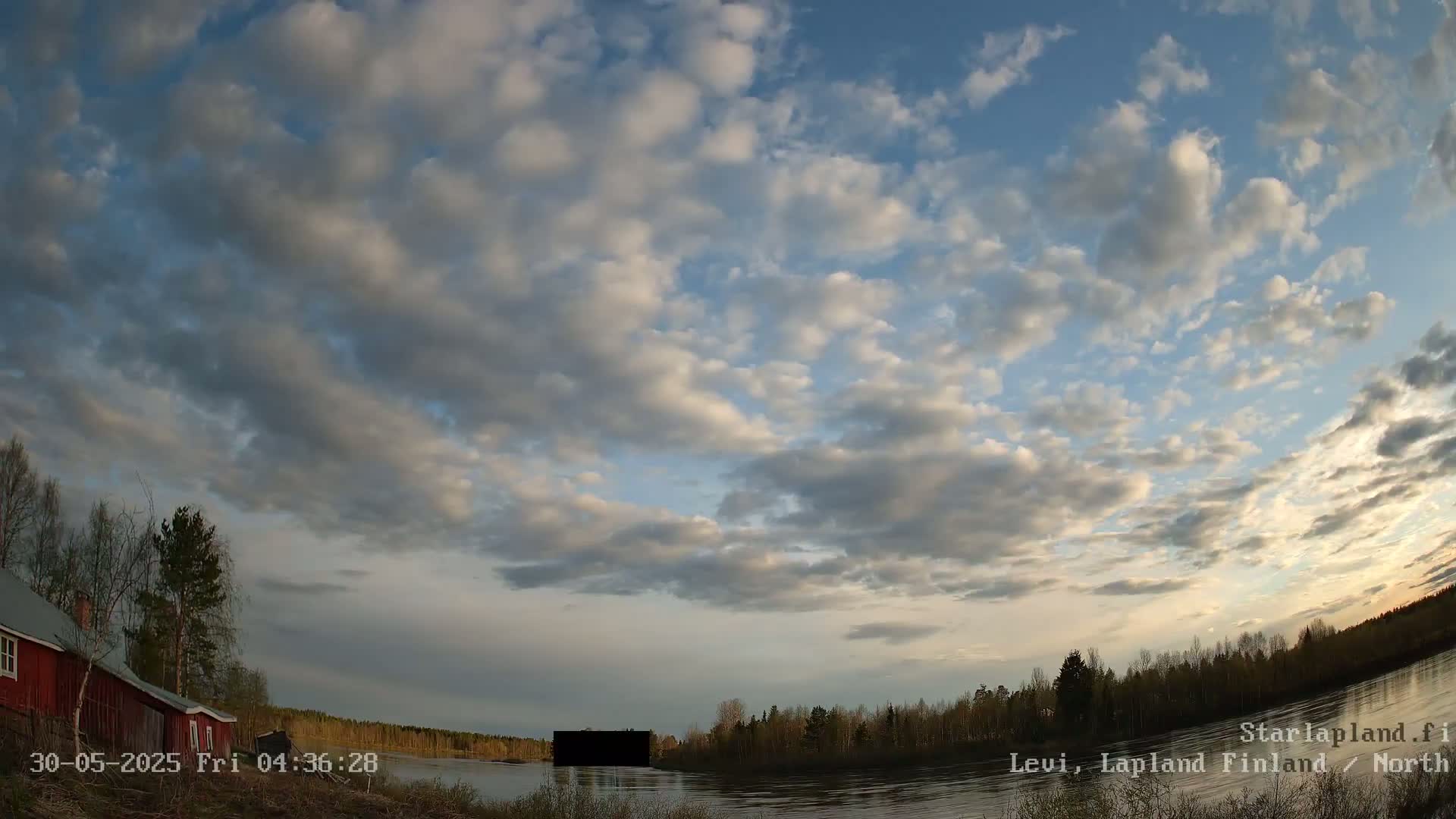 A partly cloudy sky over a calm river, with green trees lining the bank and a red building visible near the left edge.