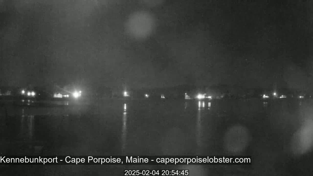 A nighttime, hazy view shows a body of water with faint lights across the opposite shore.