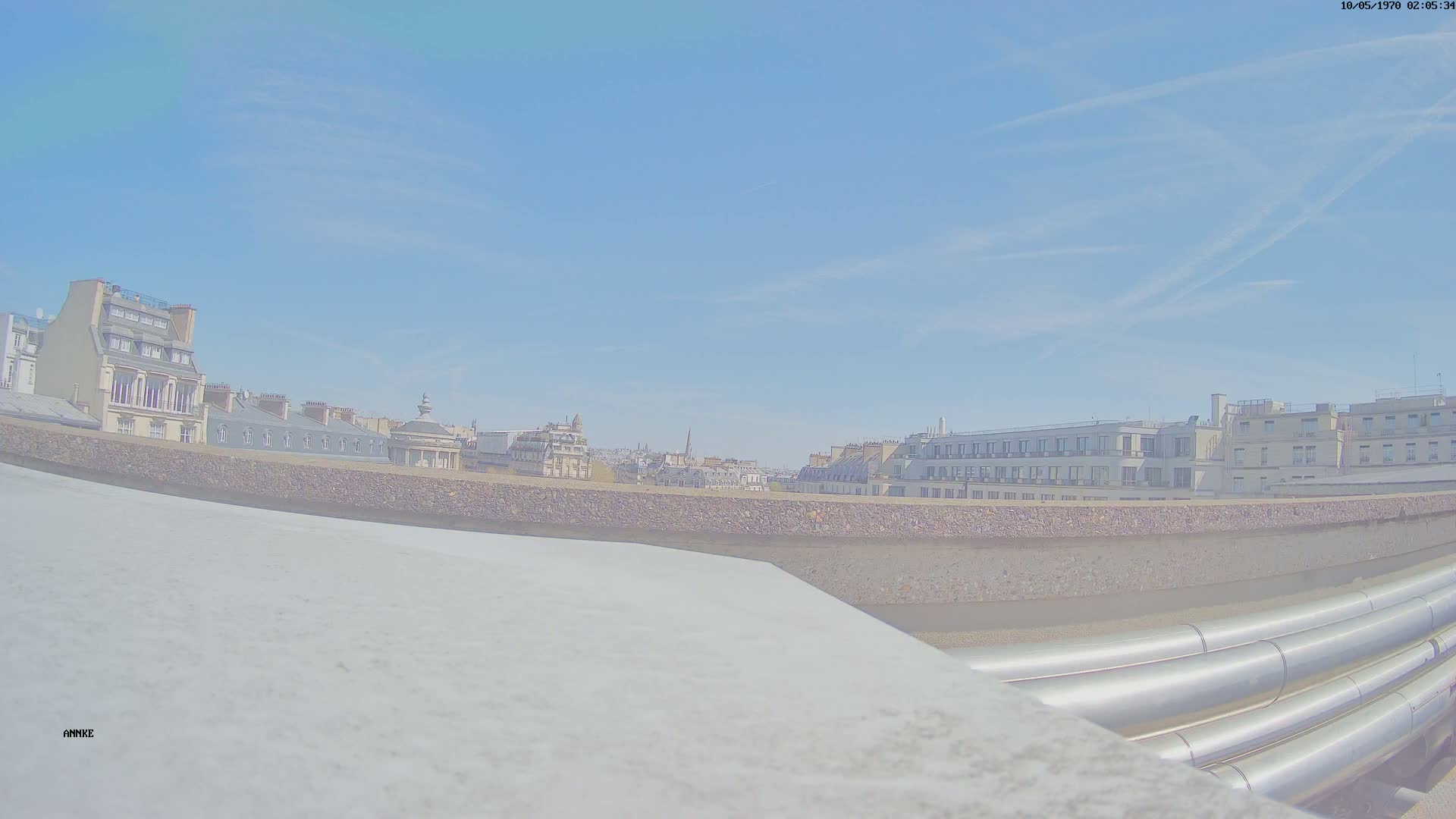 A partly sunny day reveals a cityscape of Parisian buildings viewed from a rooftop, with a low wall and metallic pipes in the foreground.