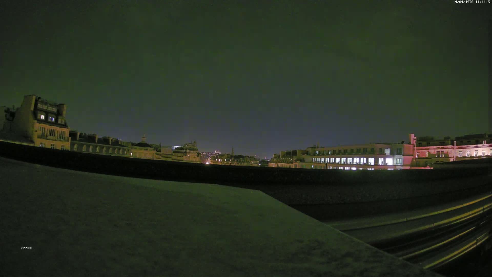 A cityscape of Parisian buildings is seen from a rooftop under a cloudy, overcast sky.
