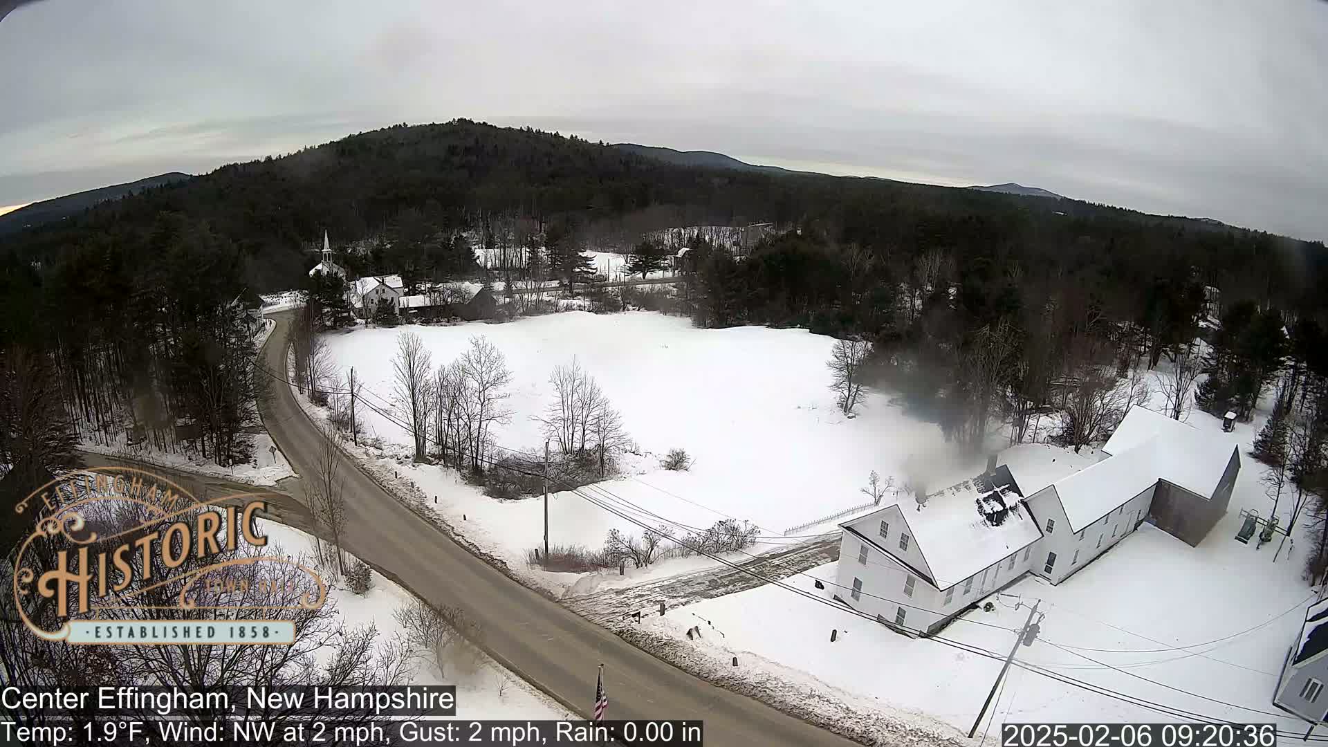 An aerial view shows a rural New Hampshire town on a partly sunny day, with a road curving past a white building and toward a forested hill in the distance.